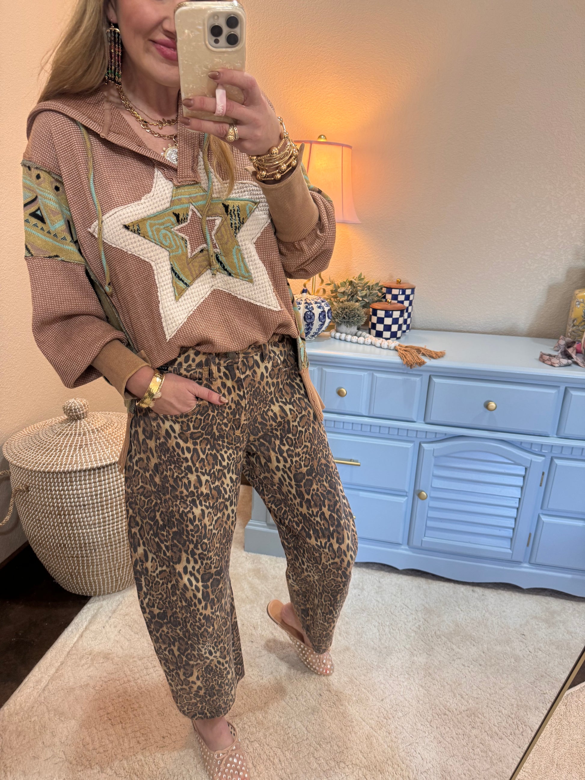 Leopard Mid Waisted Barrel Leg Jeans