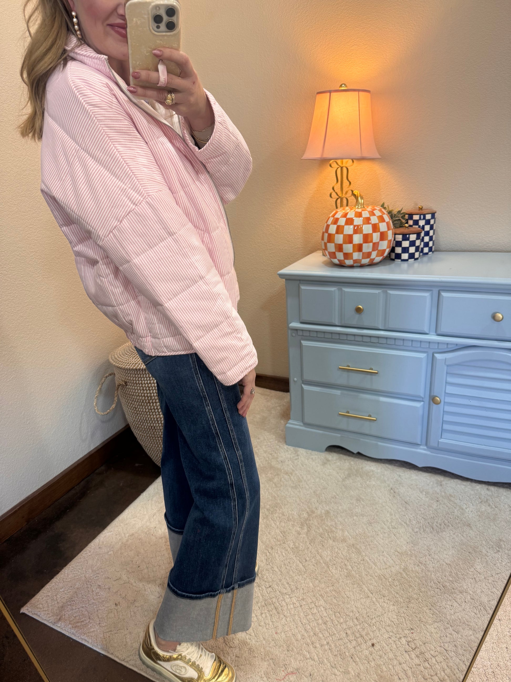 Light Oink Stripe Oxford Light Weight Quilted Jacket