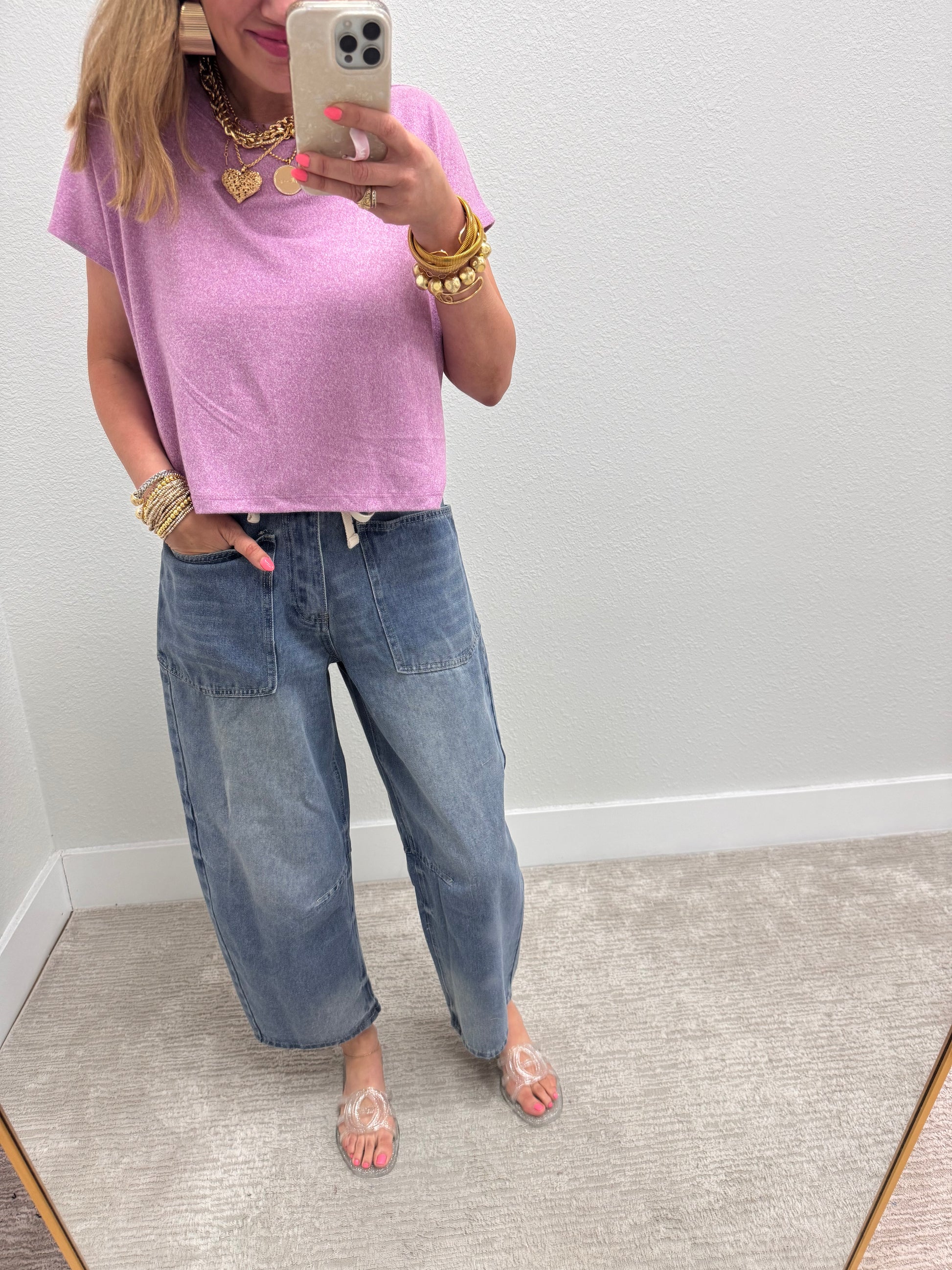 The cutest little cropped barrel jeans with a drawstring detail waist. We LOVE this pair!! With any and all top! These are cotton so there is no stretch but they are a relaxed TTS fit. Macy is 5’7 and a 24/25 in pants wearing the XS.