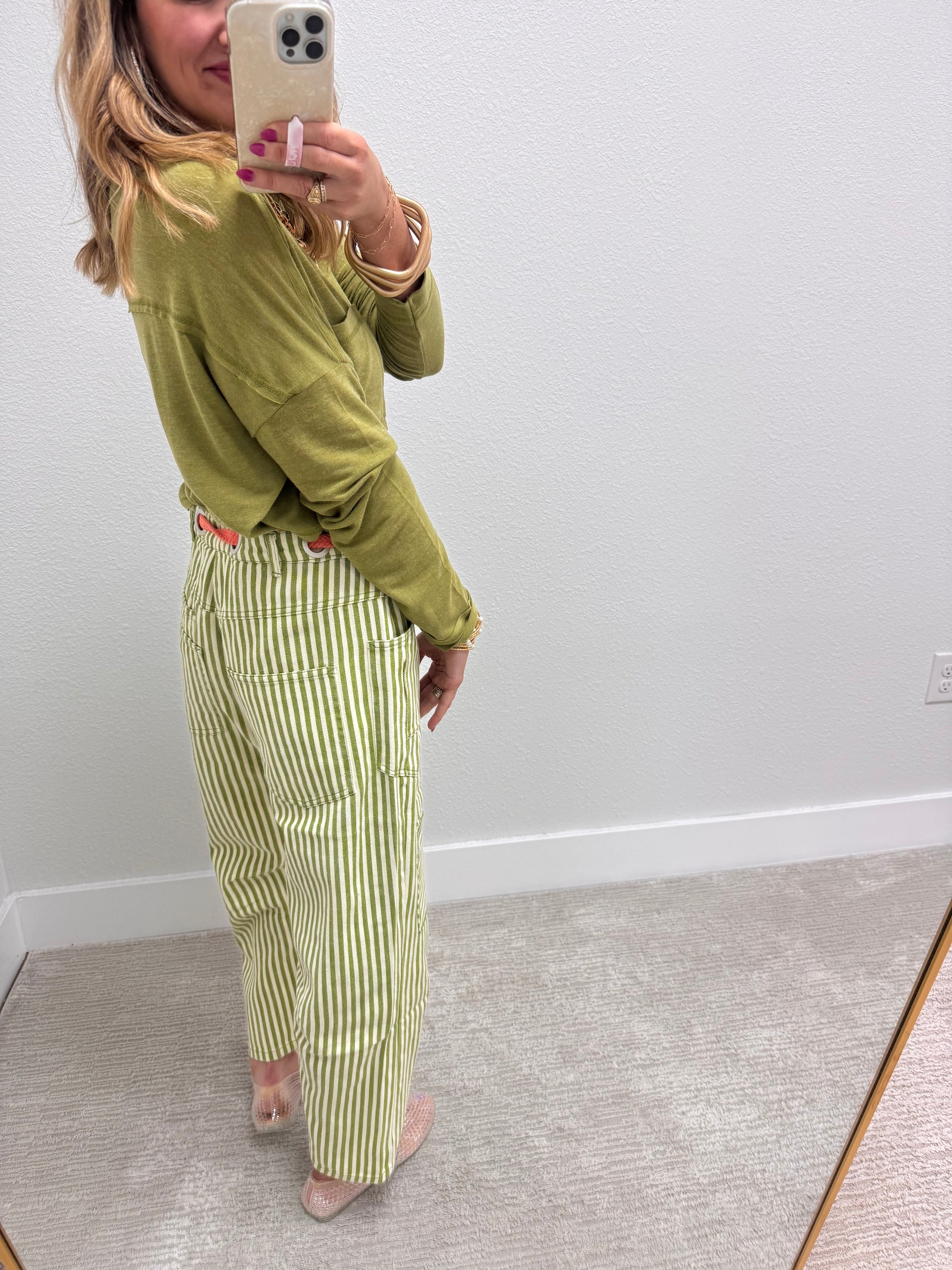 Our favorite pants are back!! These are so, so cute and look so much like the FP version! They are a loose fit and you can tie the waist as tight or as loose as you would like. Macy is a 2/4 or a 24 or 25 pants wearing the small and she has quite a bit of room but just ties them tighter. She is 5’7. Waist measurements are: