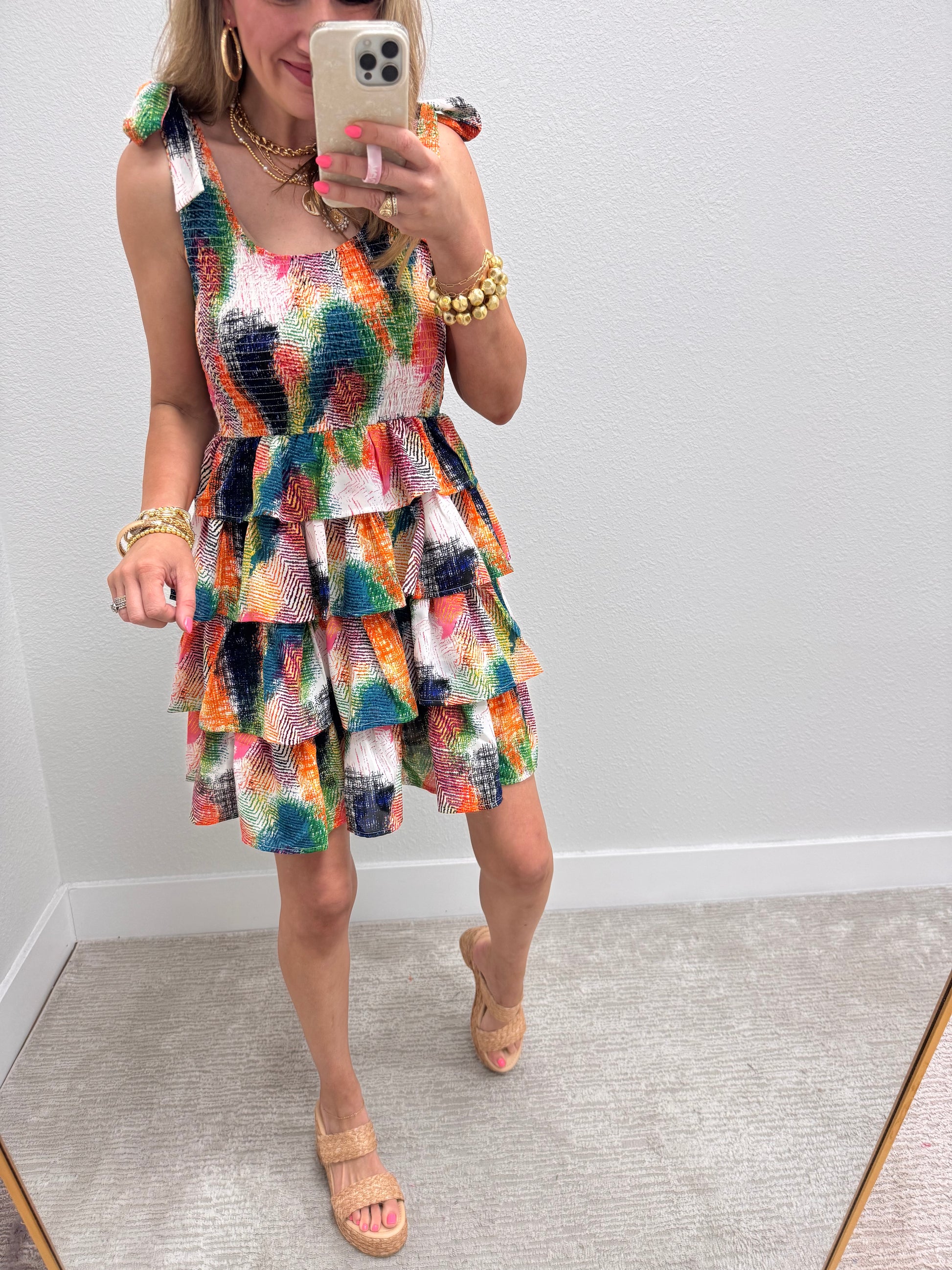 Multi Colored Tiered Tie Sleeve Dress