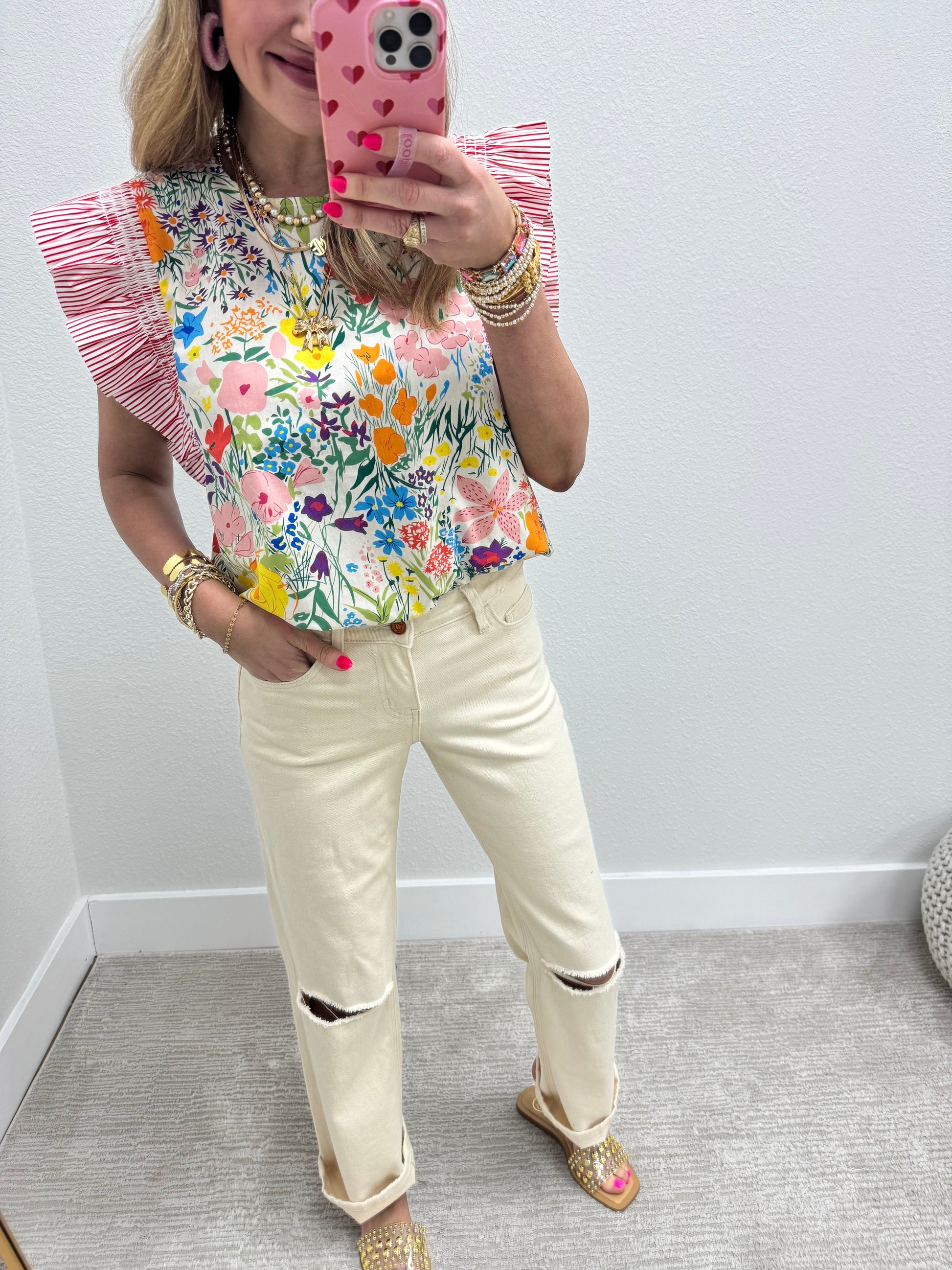 Natural Mid Rise Straight Jean With Distressed Knee FS