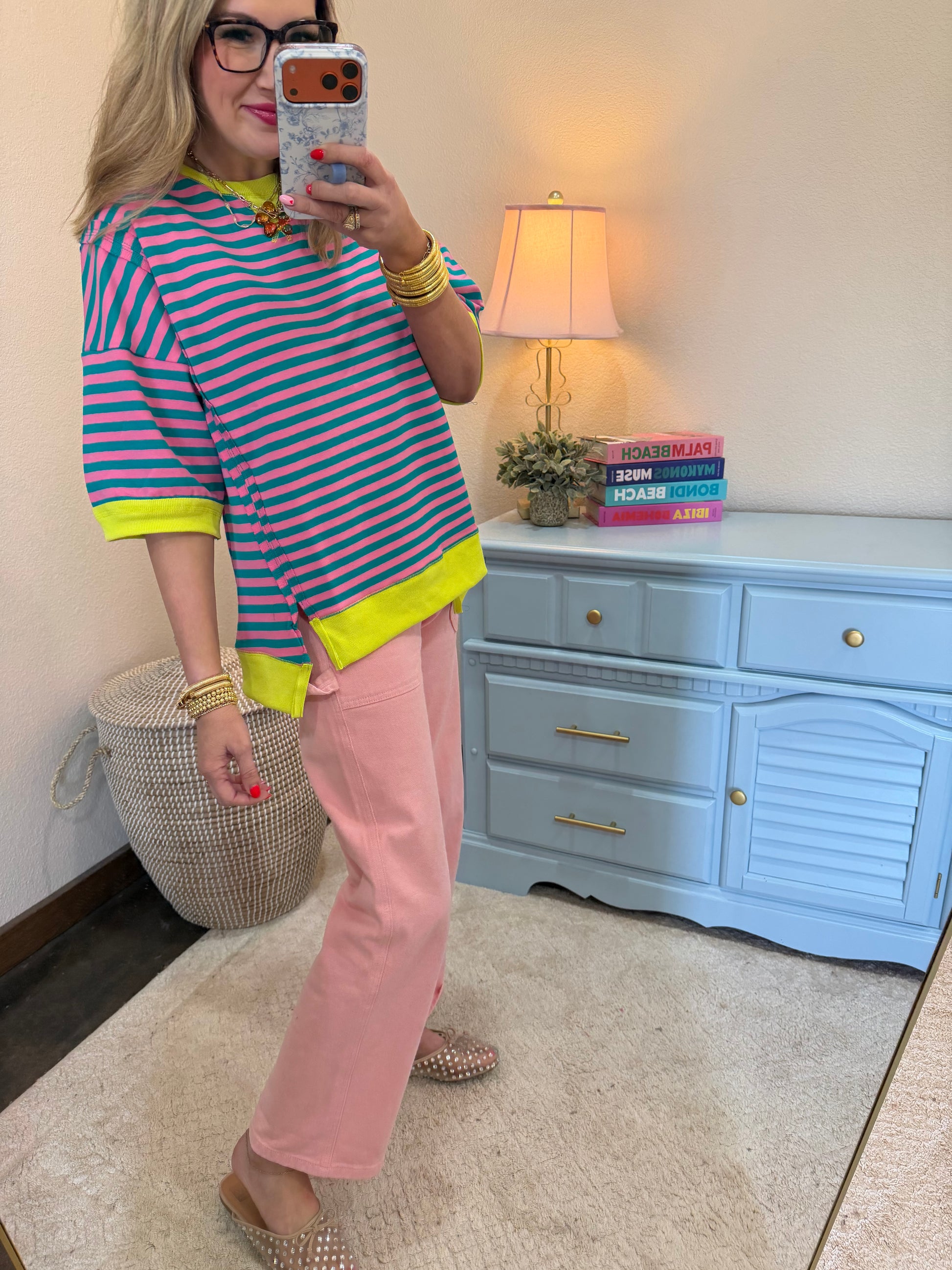 Crafted from cozy knit fabric, this top features a relaxed oversized fit that drapes beautifully and offers all-day comfort. The seafoam and pink stripes add a playful yet sophisticated touch that pairs perfectly with denim, leggings, or your favorite casual bottoms. Whether you're running errands, meeting friends for coffee, or lounging at home, this versatile piece delivers effortless style.