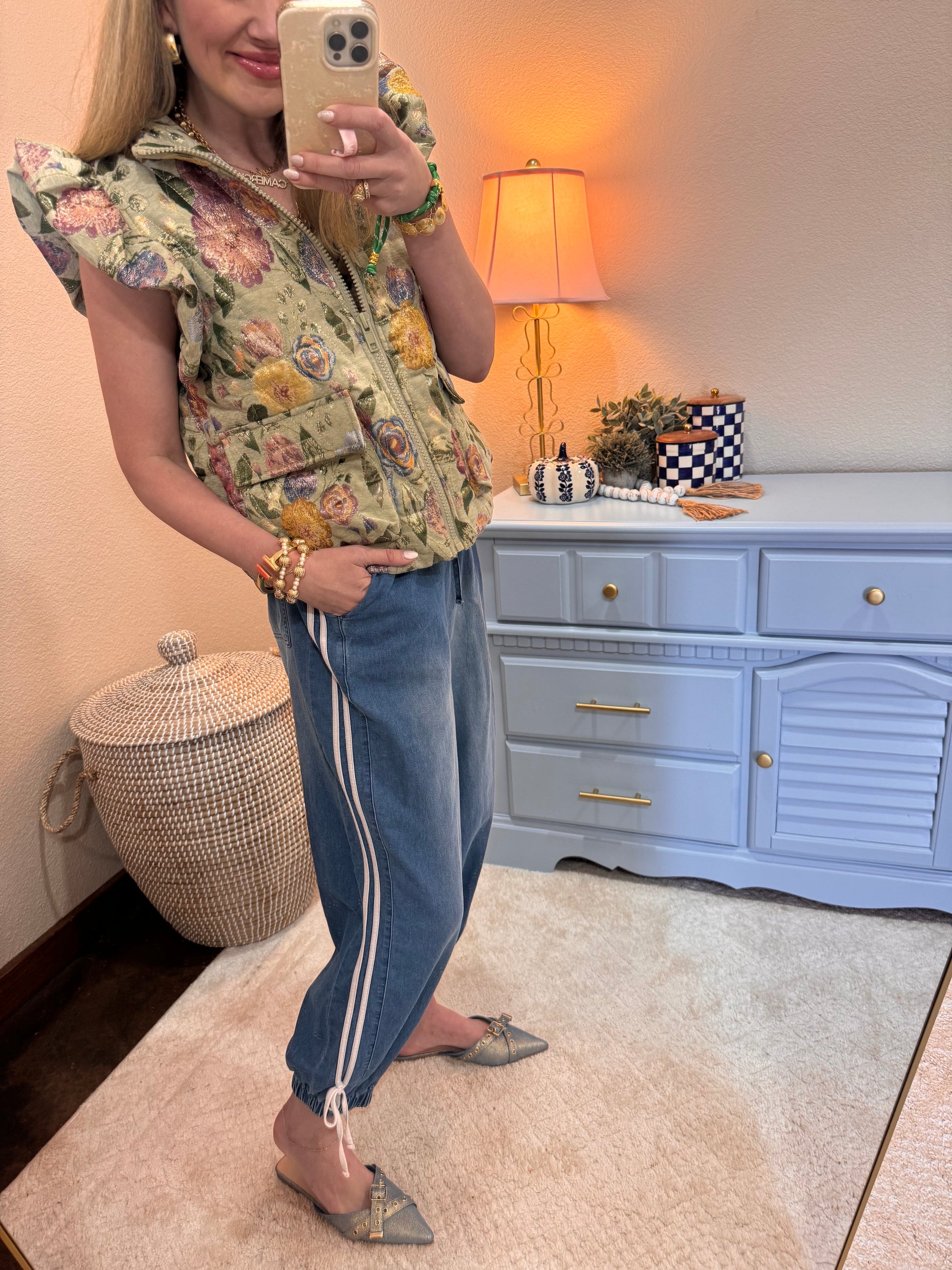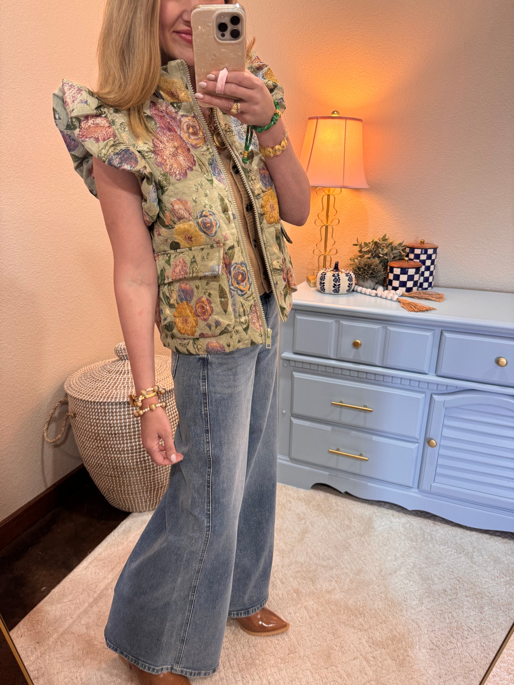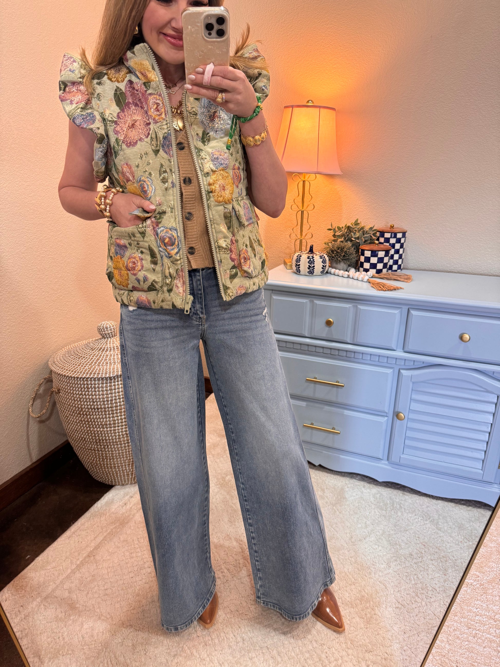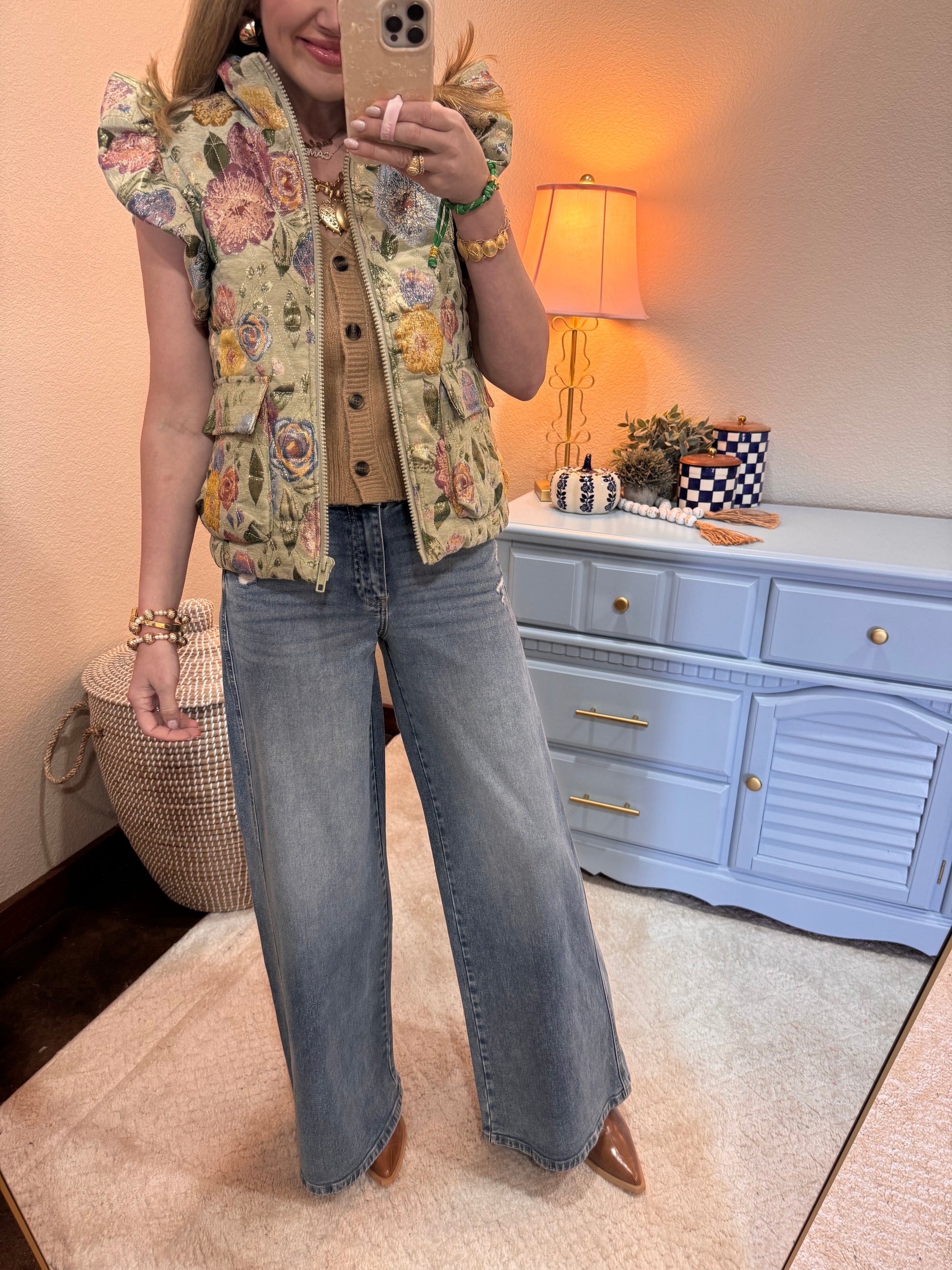 We fell in love with these vests the minute we found them! They have a shiny thread through out which makes them stand out and the have the cutest ruffle sleeves. Relaxed fit, Macy is a 2/4 and 5’7 wearing the small. 80% Poly, 20% Rayon.
