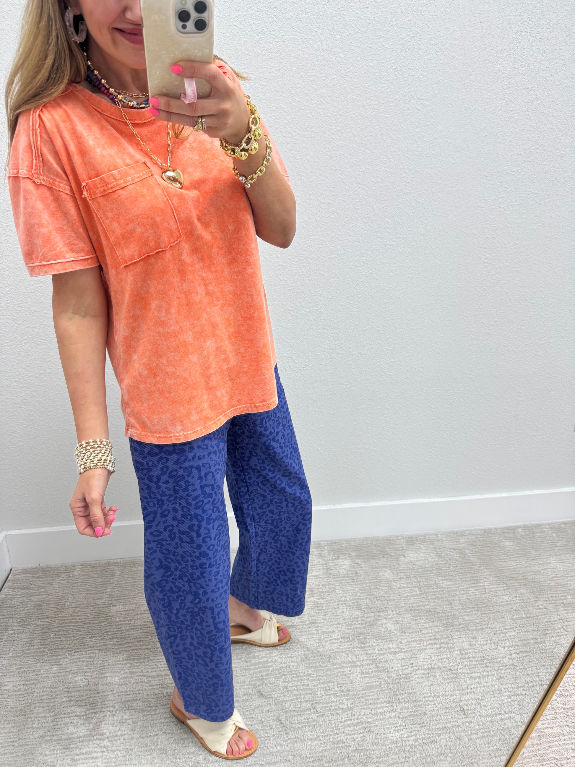 We LOVE this little top, so perfect and easy for spring and summer. It is a mineral washed color and has cute raw edges and is a relaxed fit, Macy is a 2/4 and 5'7 wearing the small