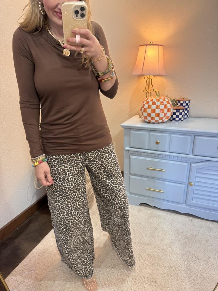 Brown Brushed Microfiber Long Sleeve Round Neck Tee