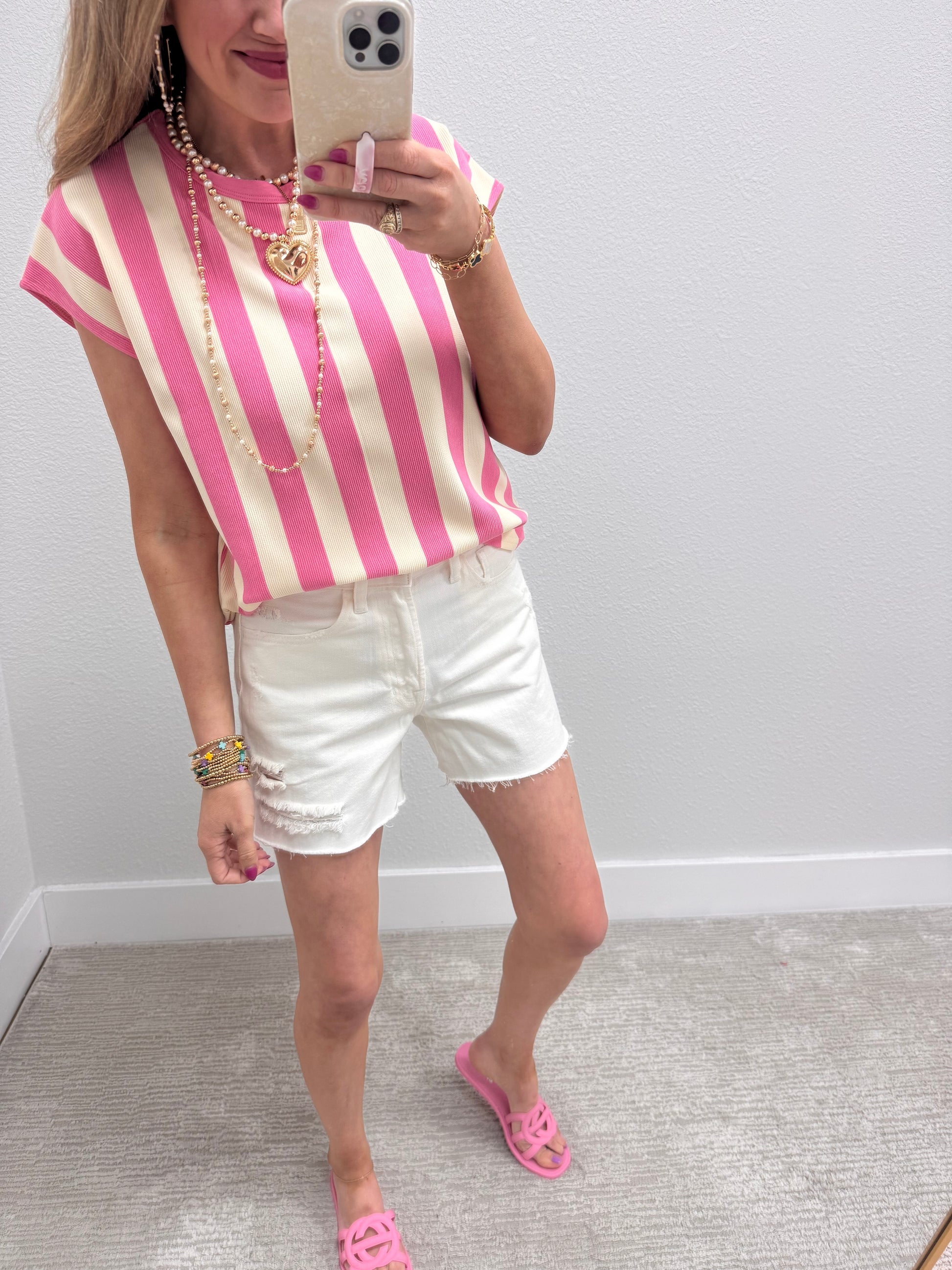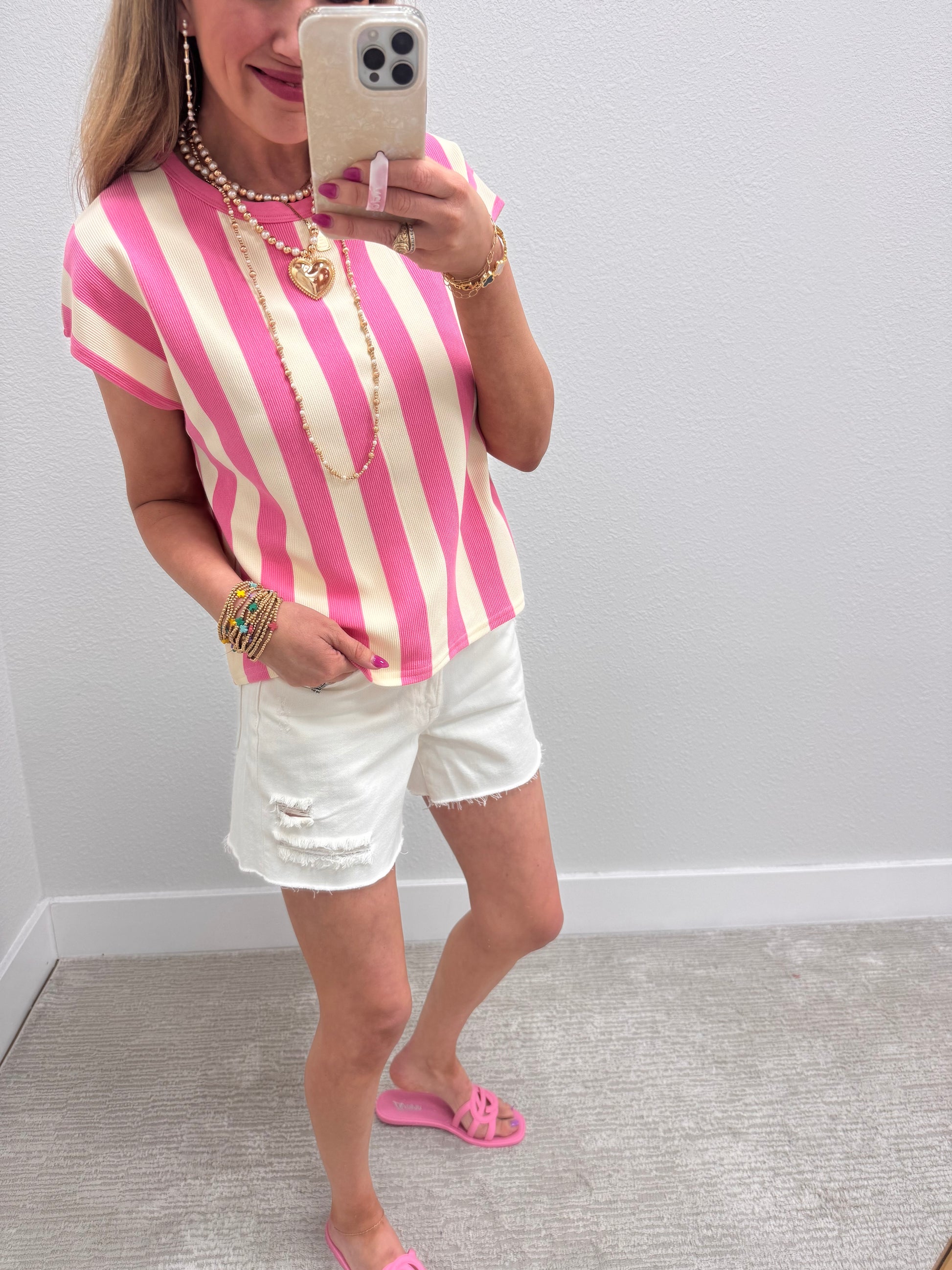 Our best selling striped textured top is now back in a new version! These are just an easy every day top and still so cute. These are a relaxed fit, Macy is a 2/4 and 5'7 wearing the small. 60% Poly, 35% cotton, 5% spandex