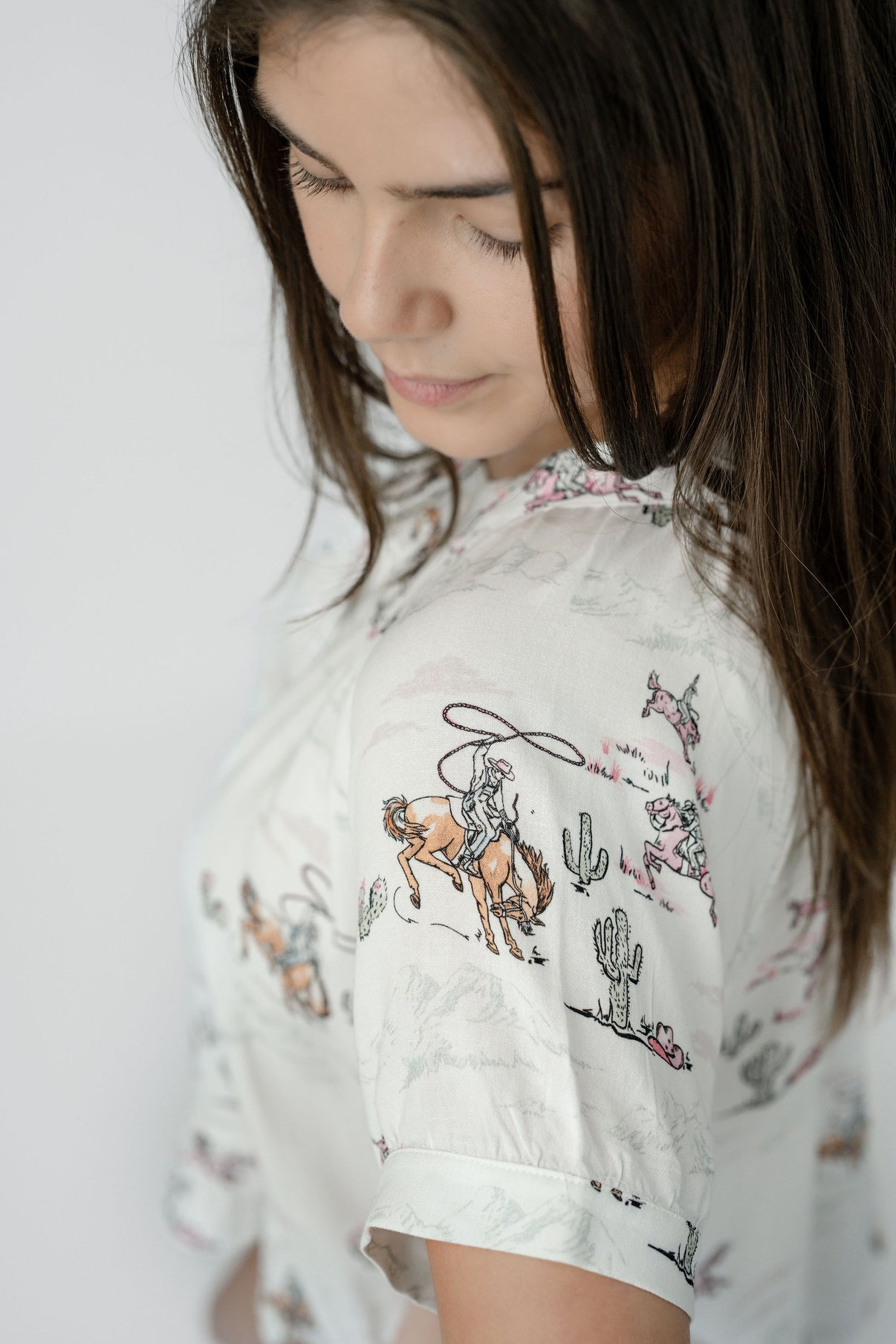 Lasso your dreams in this charming western-themed pajama set featuring playful cowgirl elements! Perfect for the modern cowgirl who loves a touch of ranch-inspired style, this delightful print celebrates the spirit of the West with lassos, boots, and all the iconic elements of cowgirl life.