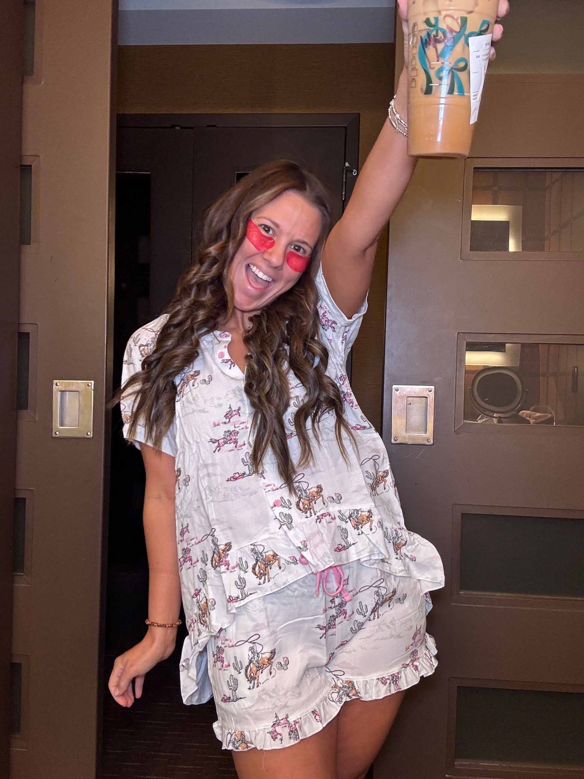 Heather Welper Pink and White Lasso Lady Western PJ Ruffle Short Set