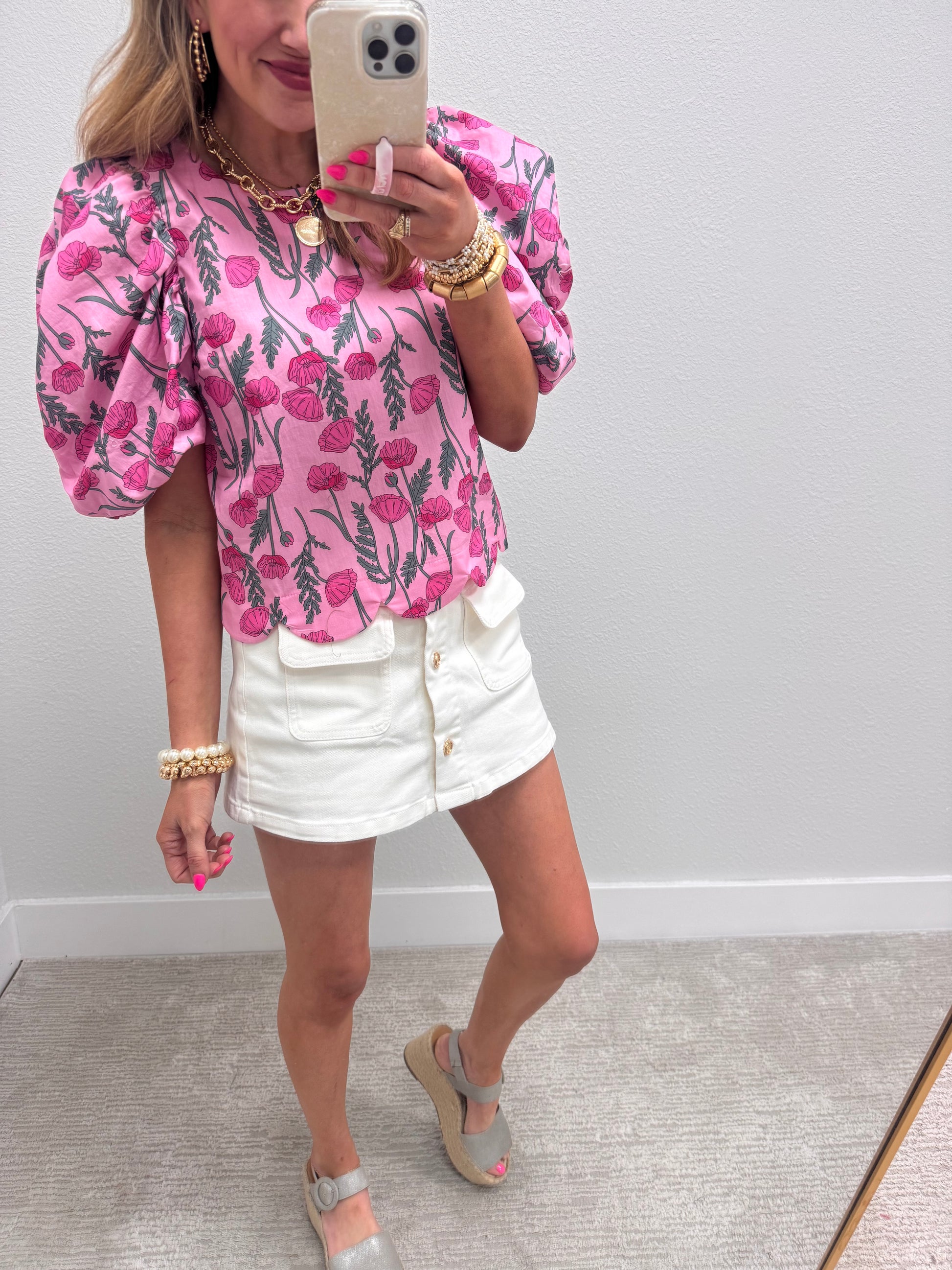 Pink Flower Puff Sleeve Scalloped Trim Top