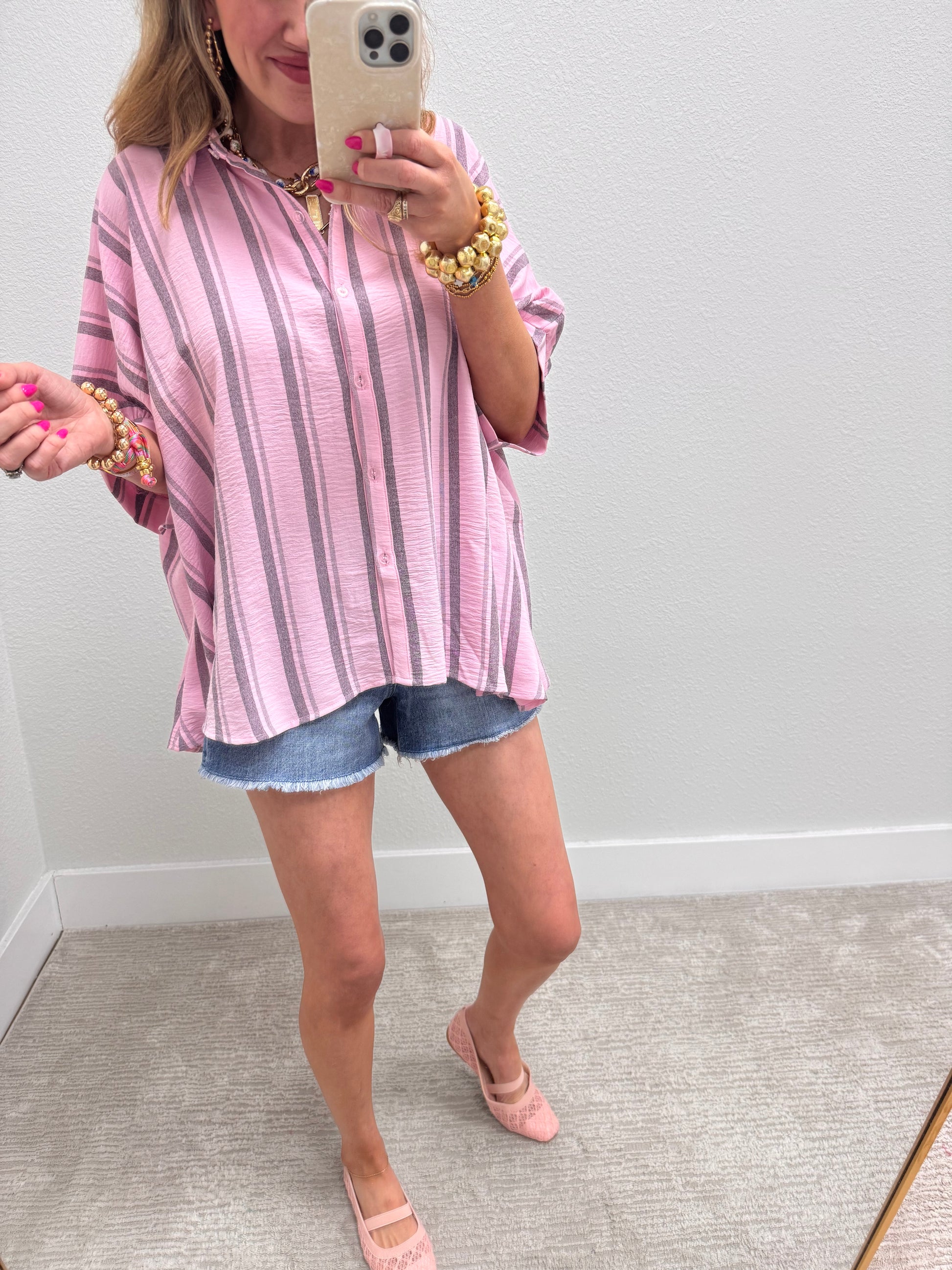 Pink Grey Woven Stripe Oversized Button Down Shirt
