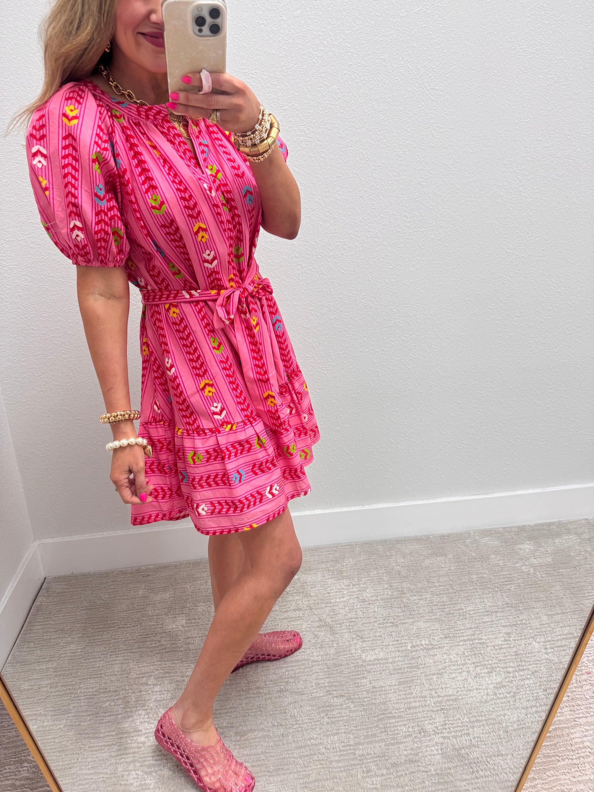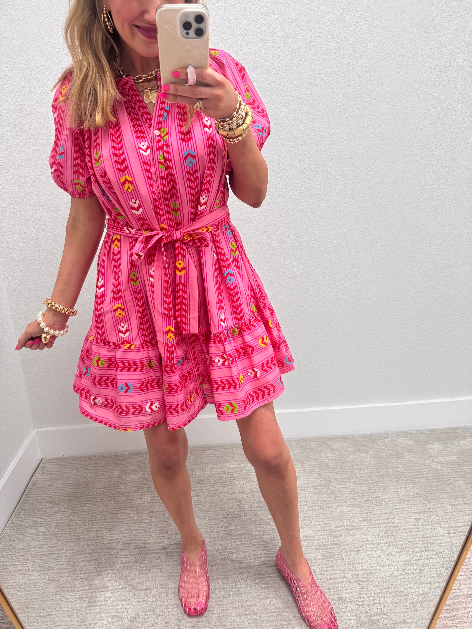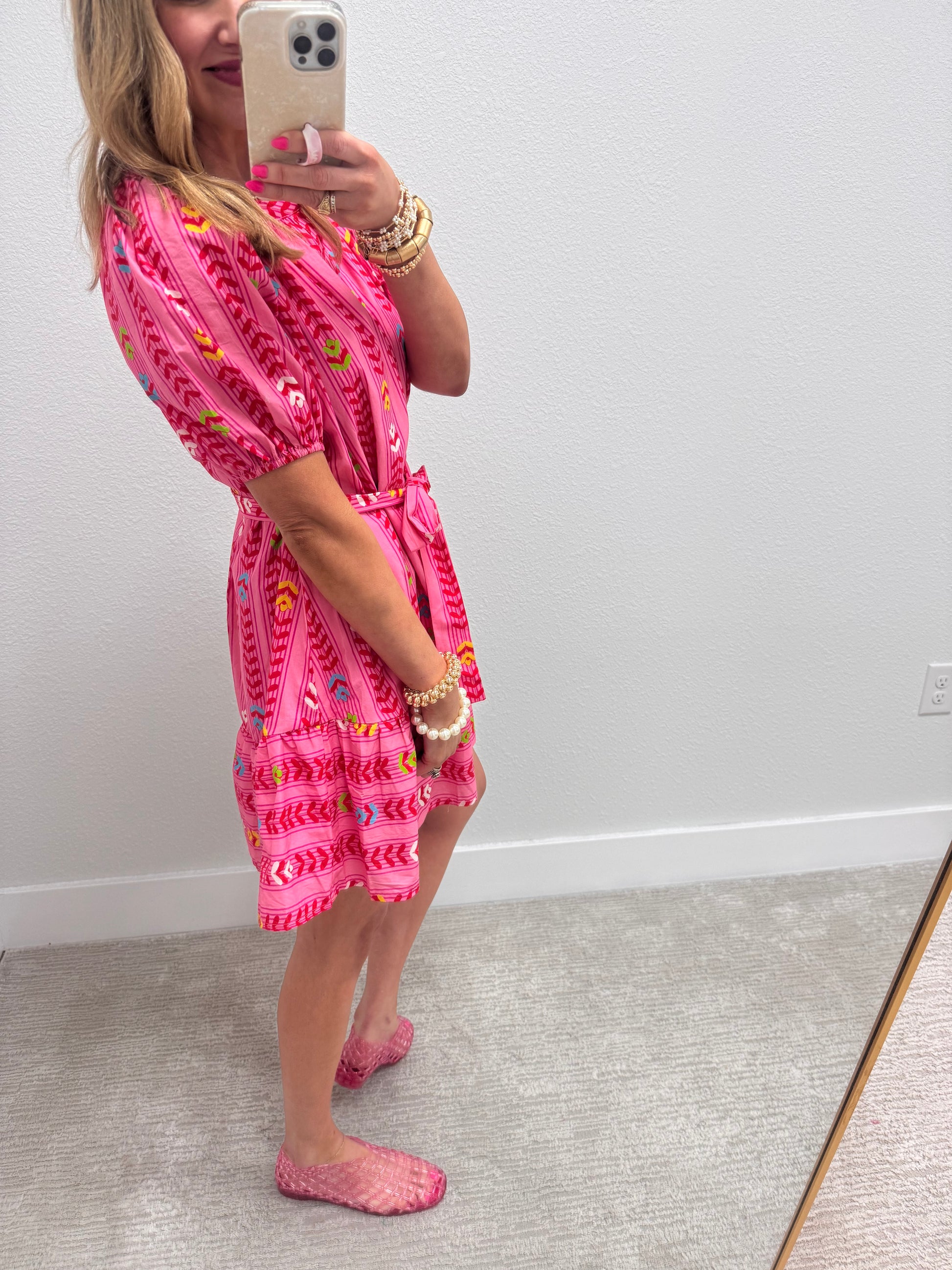 The exclusive print we love, in a new adorable dress! It is cotton so there is no stretch but it is a roomy fit and can be worn with or without the belt. Macy is a 2/4 and 5'7 wearing the small with plenty of room