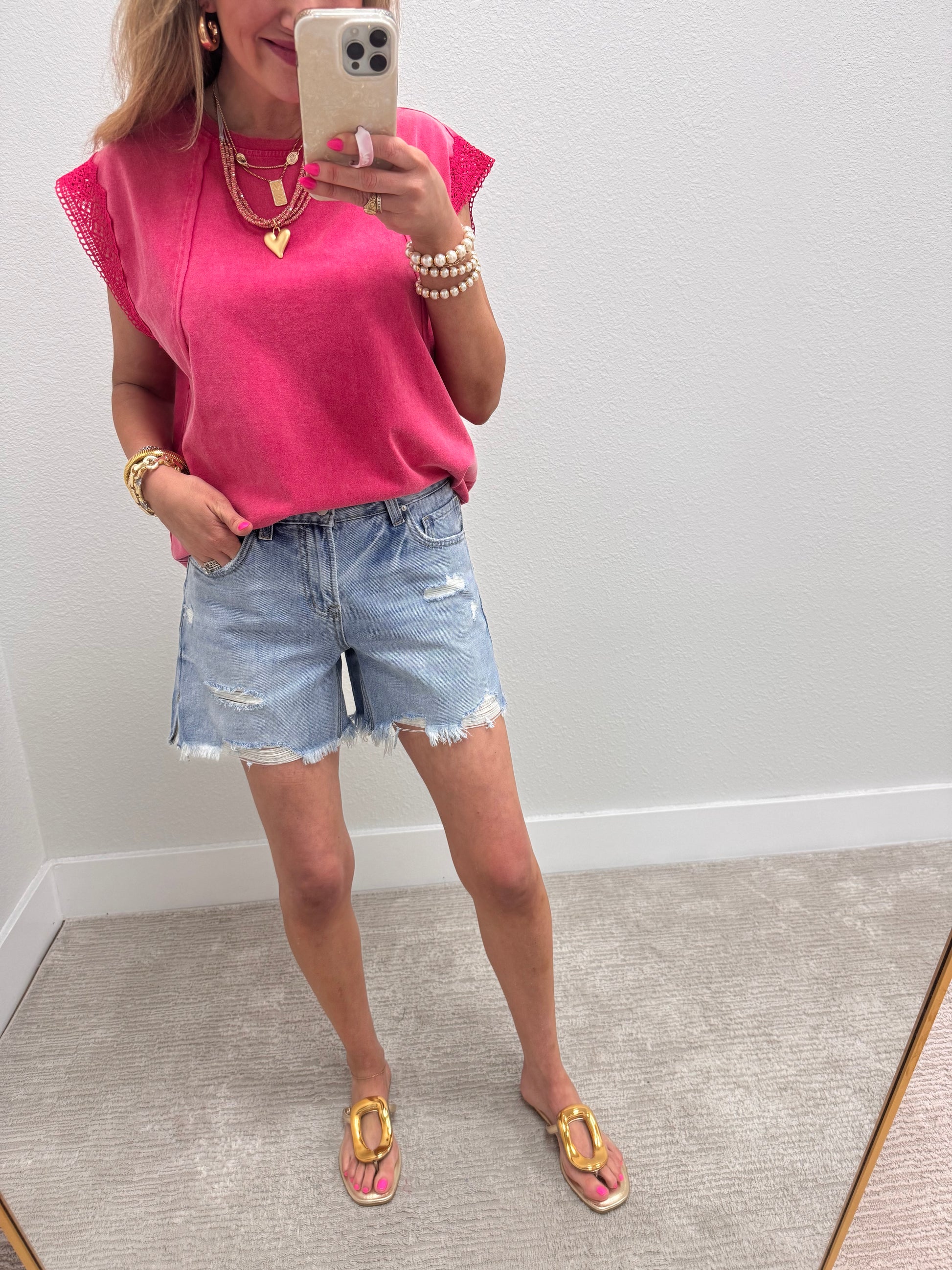 Such an easy and cute little top with great detail. It’s a relaxed/roomy fit, Macy is a 2/4 and 5’7 wearing the small