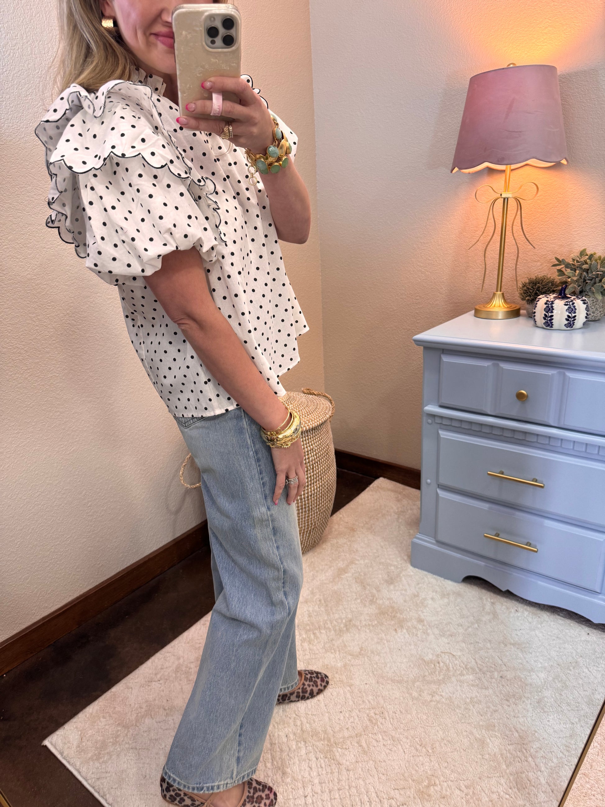 Polka Dot Contrast Edge Scallop Ruffle Top