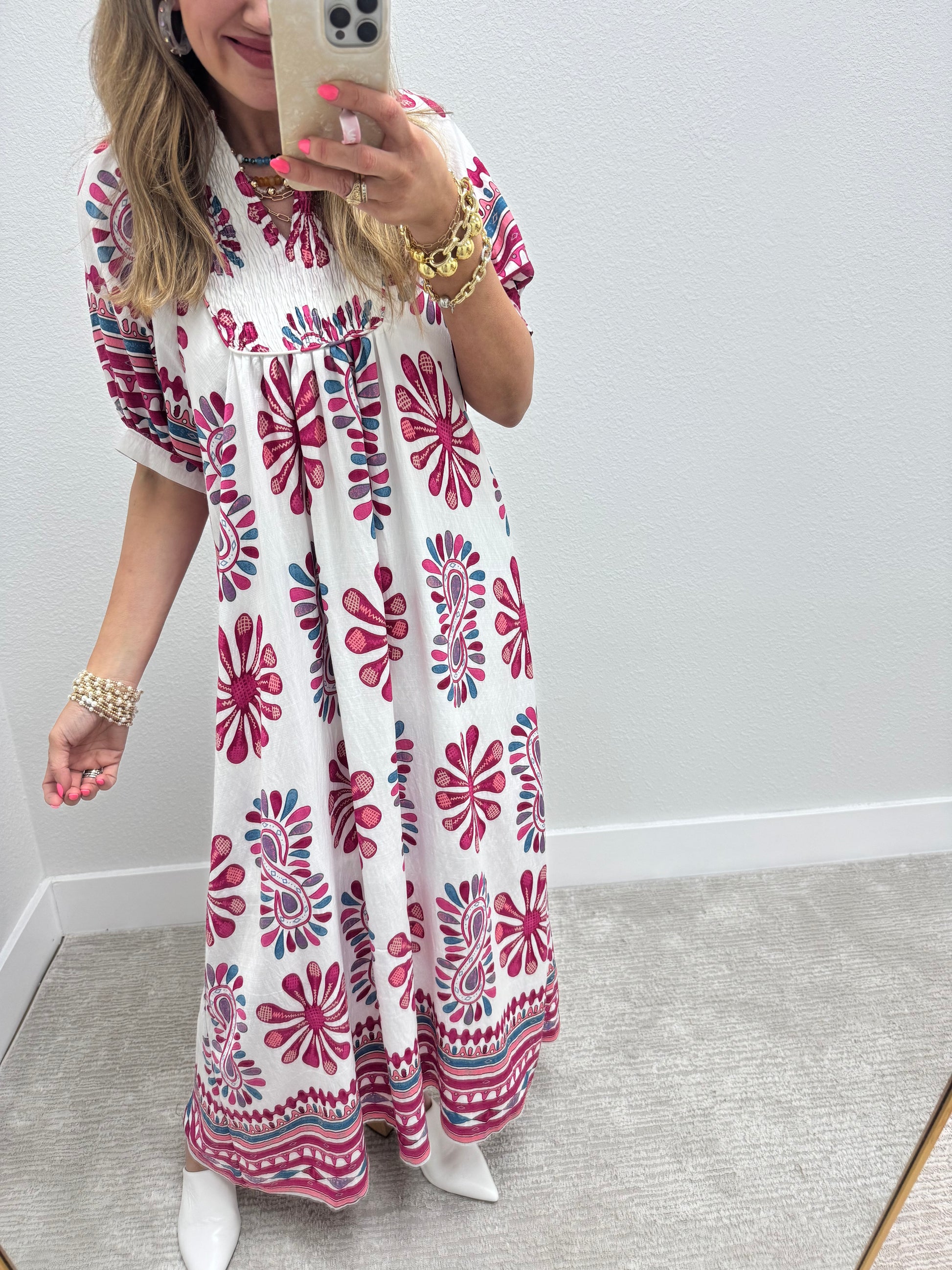 Oh this dress is sooooo cute! It is the prettiest color and such a cute fit. It’s smocked on the top and cute short sleeve balloon sleeves and the dress is lined 3/4 of the way. There is no stretch but it’s a relaxed fit, Macy is a 2/4 and 5’7 wearing the small