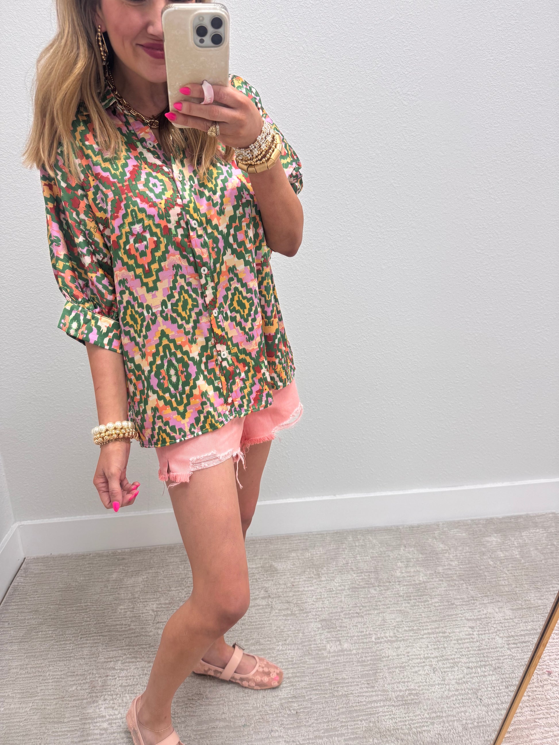 A roomy/oversized fit and so cute! Macy is a 2/4 and 5’7 wearing the small