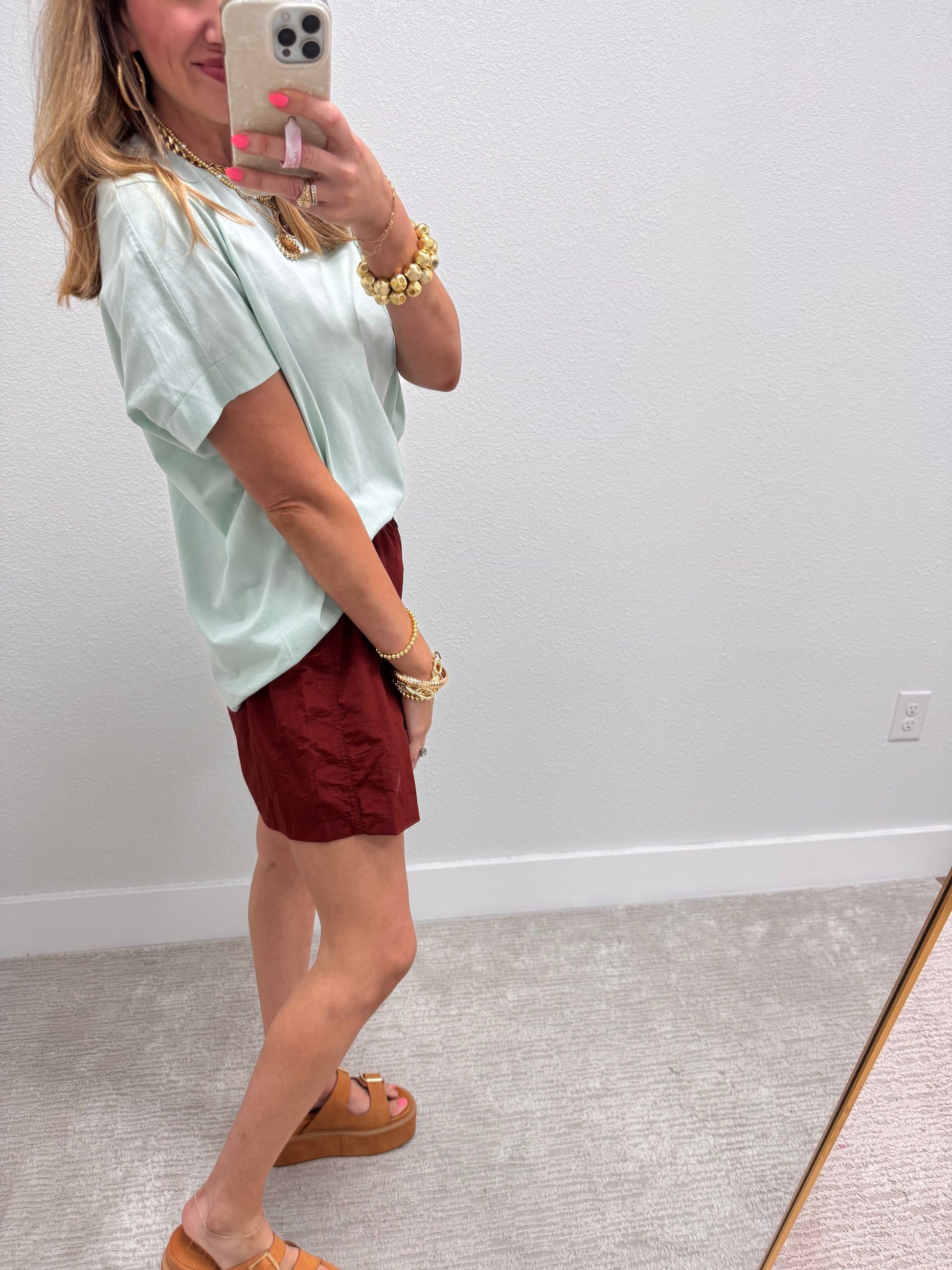 A fun little boxer style of shorts, but a nylon (windbreaker) material, so cute!! These are an elastic waist and are a roomy fit, Macy is a 2/4 and 5’7 wearing the small with room