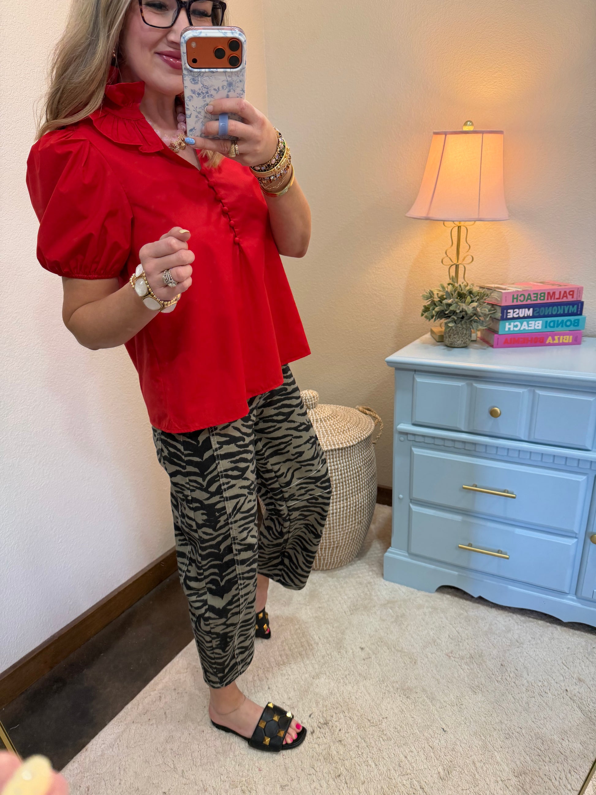 How amazing is this little top?! The high neck is stunning. This is cotton so there is no stretch but it’s a relaxed TTS fit. Macy is a 2/4 and 5’7 wearing the small