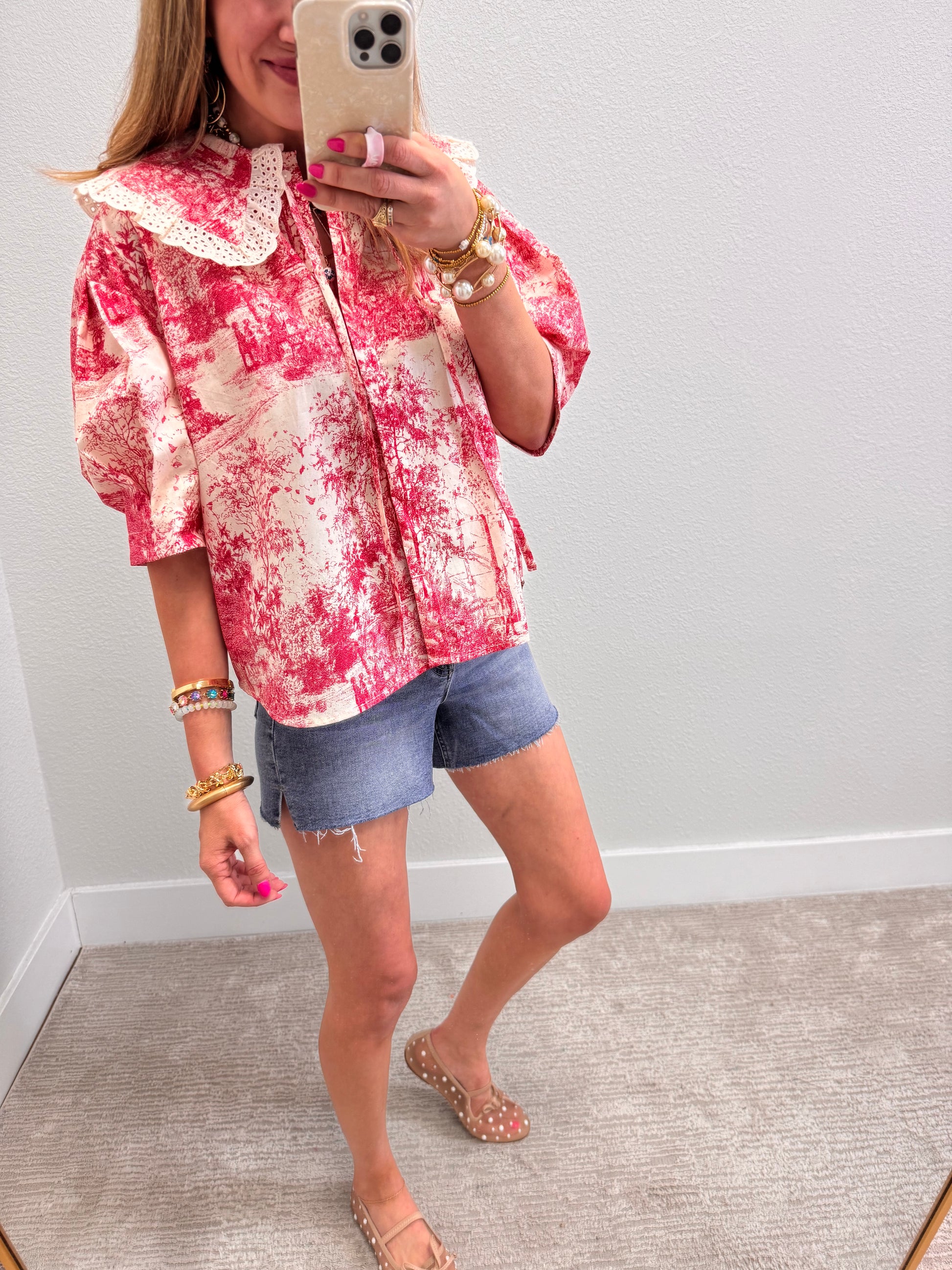Red Vintage Print Top with Lace Trim Peter Pan Collar