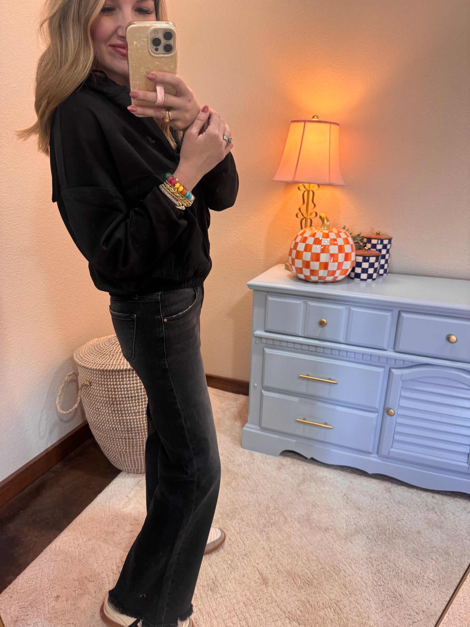 Risen always makes the best jeans and these are no different! A great pair of Black wide leg and a low/mid rise fit!! They are a tts fit, Macy is a 24/25 wearing the 24 and she is 5’7. Approx a 8.75” rise and approx a 32” inseam. 93%cotton, 5% poly, 2% spandex