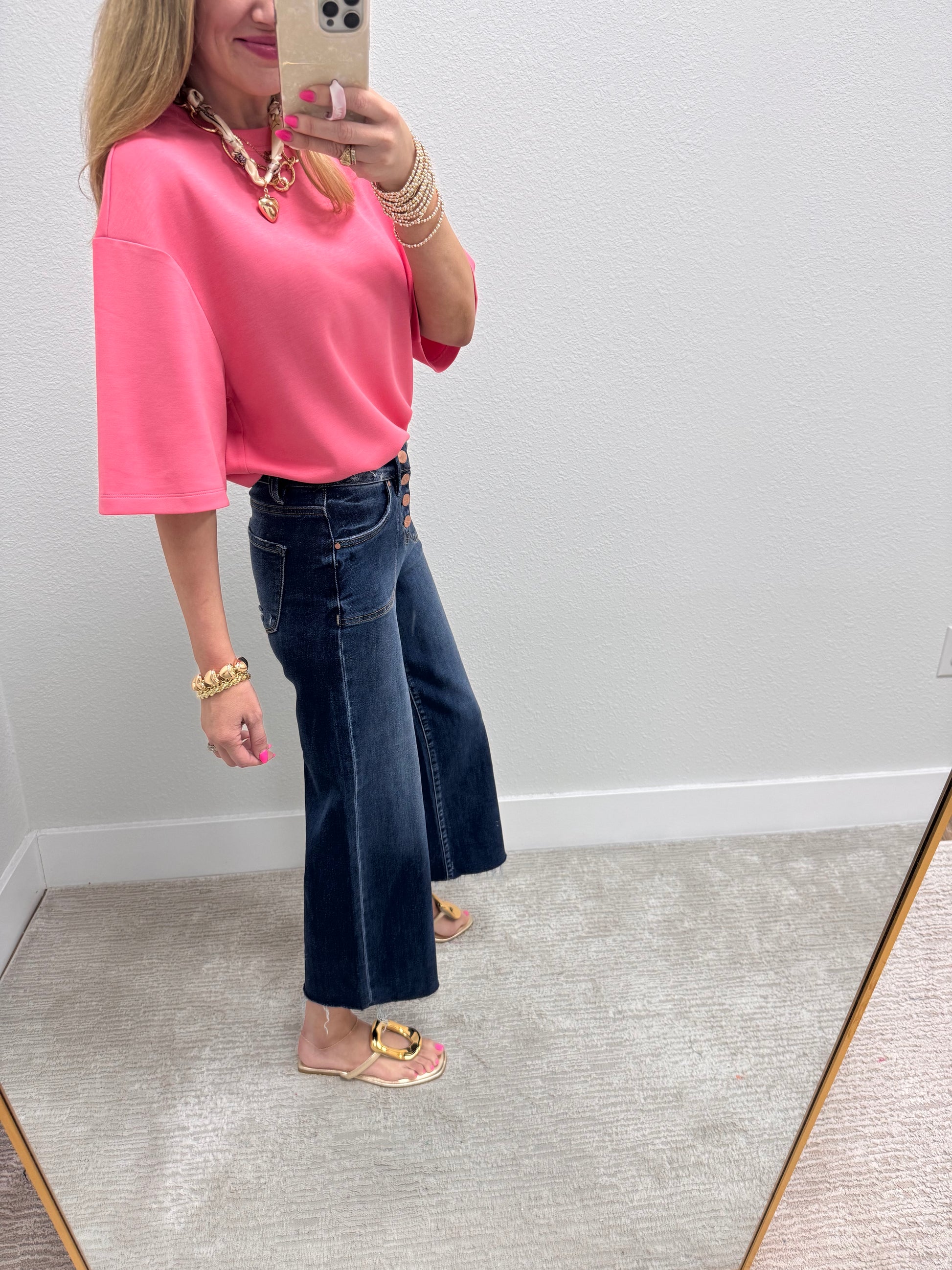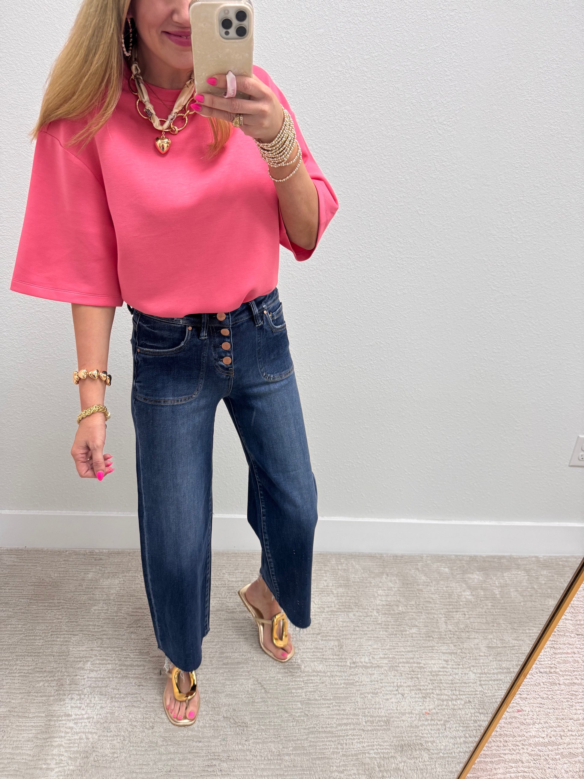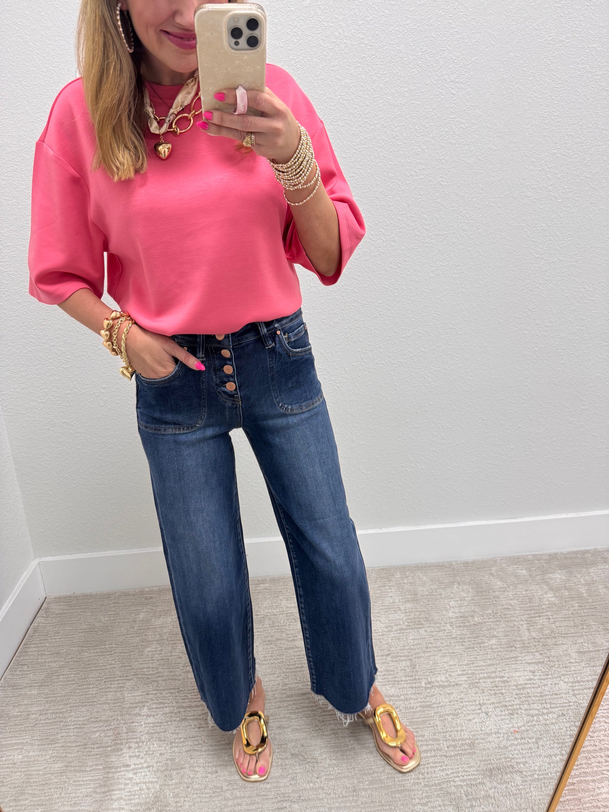 We love love love this pair of jeans!!! The button fly and they are such a cute fit. They are stretchy and TTS, Macy is a 24 or 25 wearing the 24 and she is 5’7. 64% cotton, 20% tencel, 4% poly, 2% spandex. They have approx a 10” rise and approx 26” inseam
