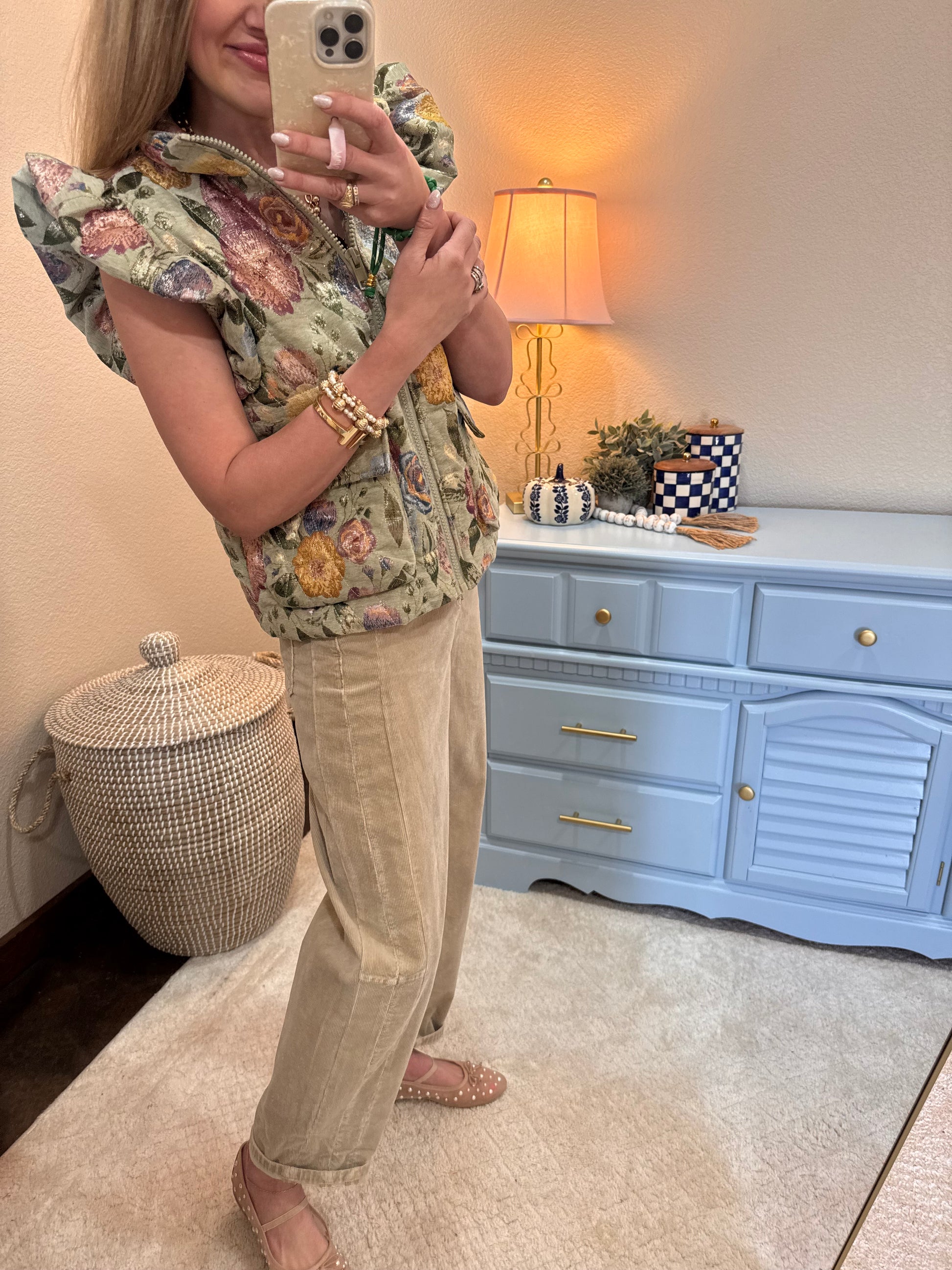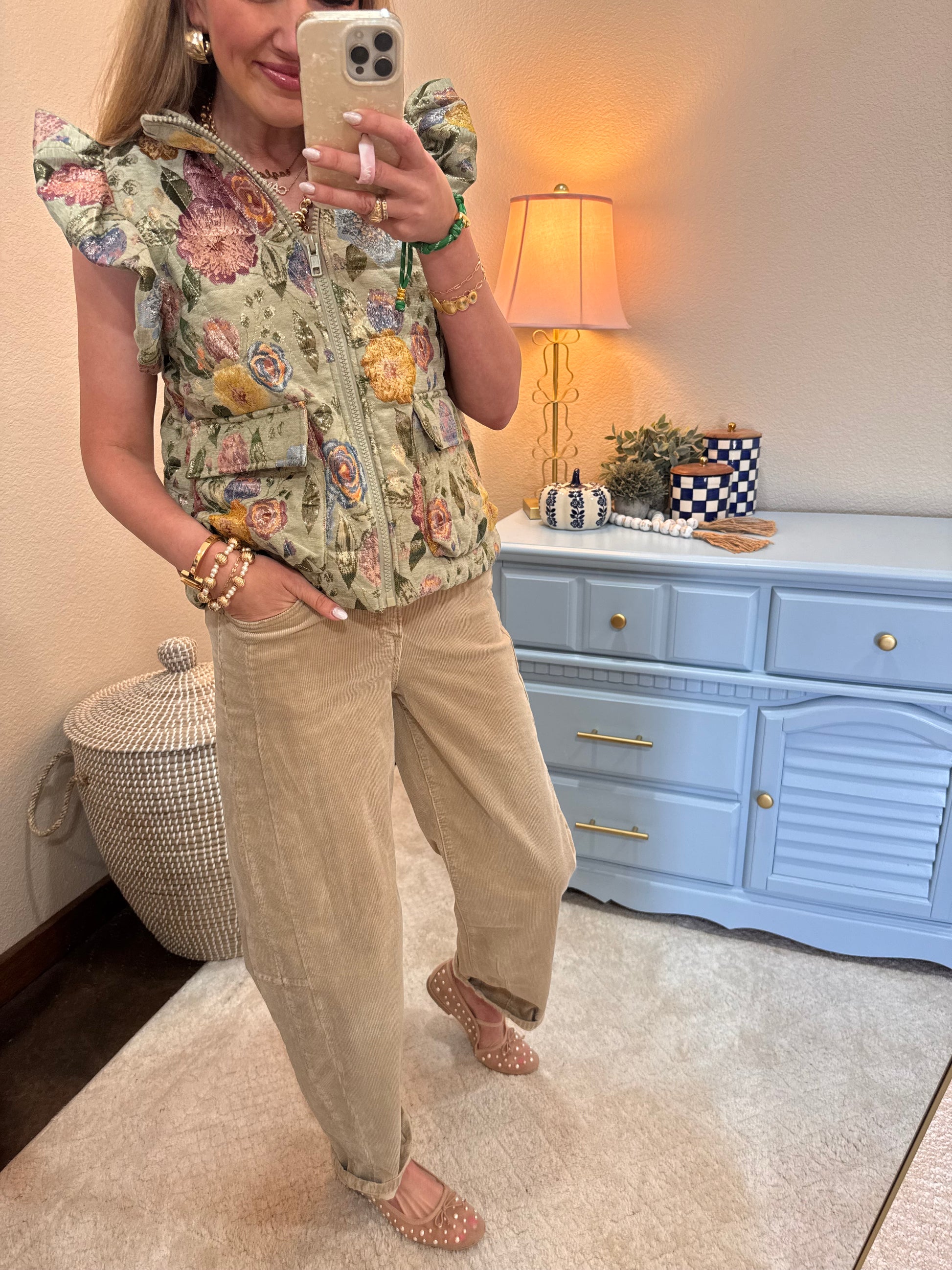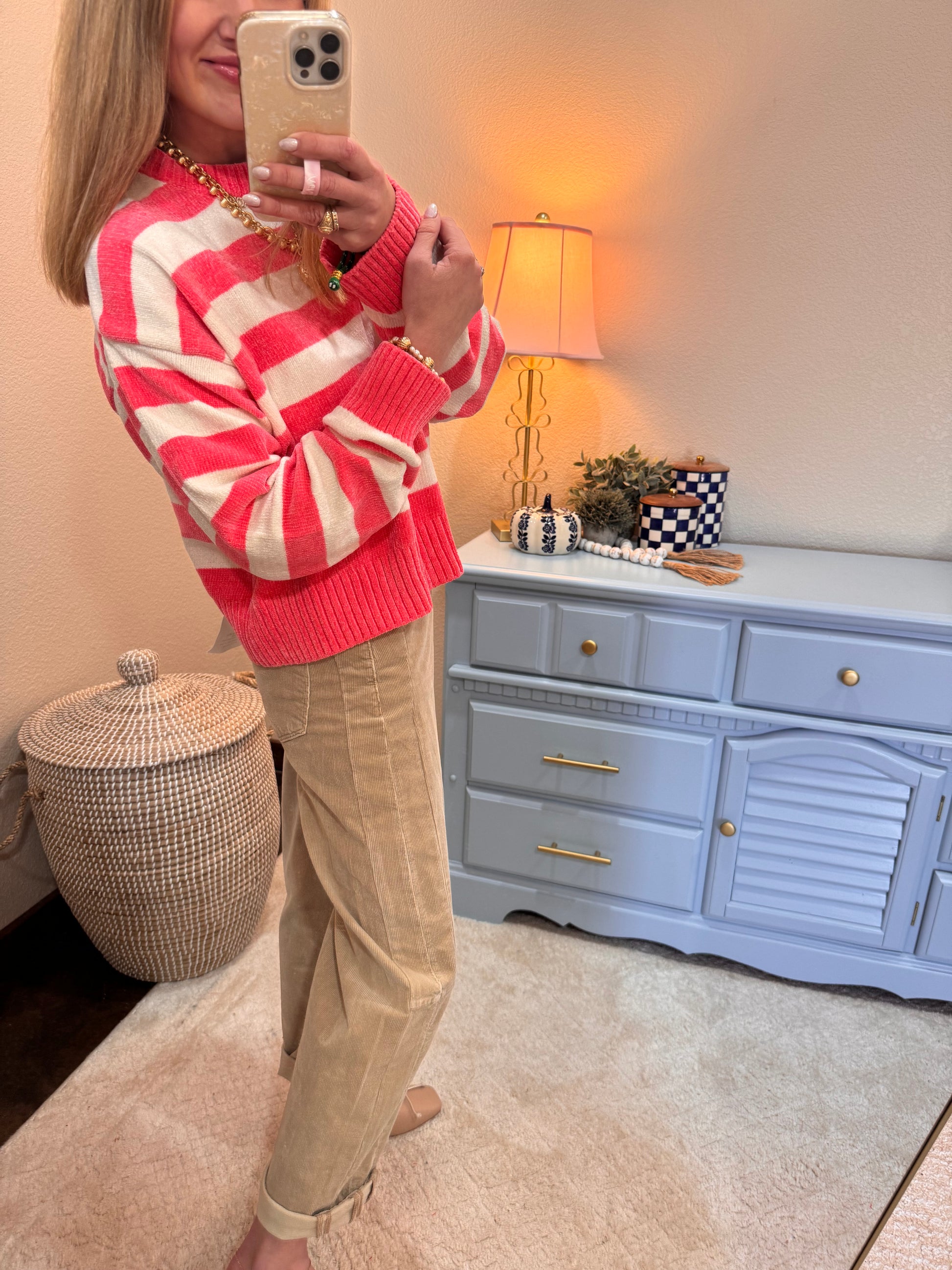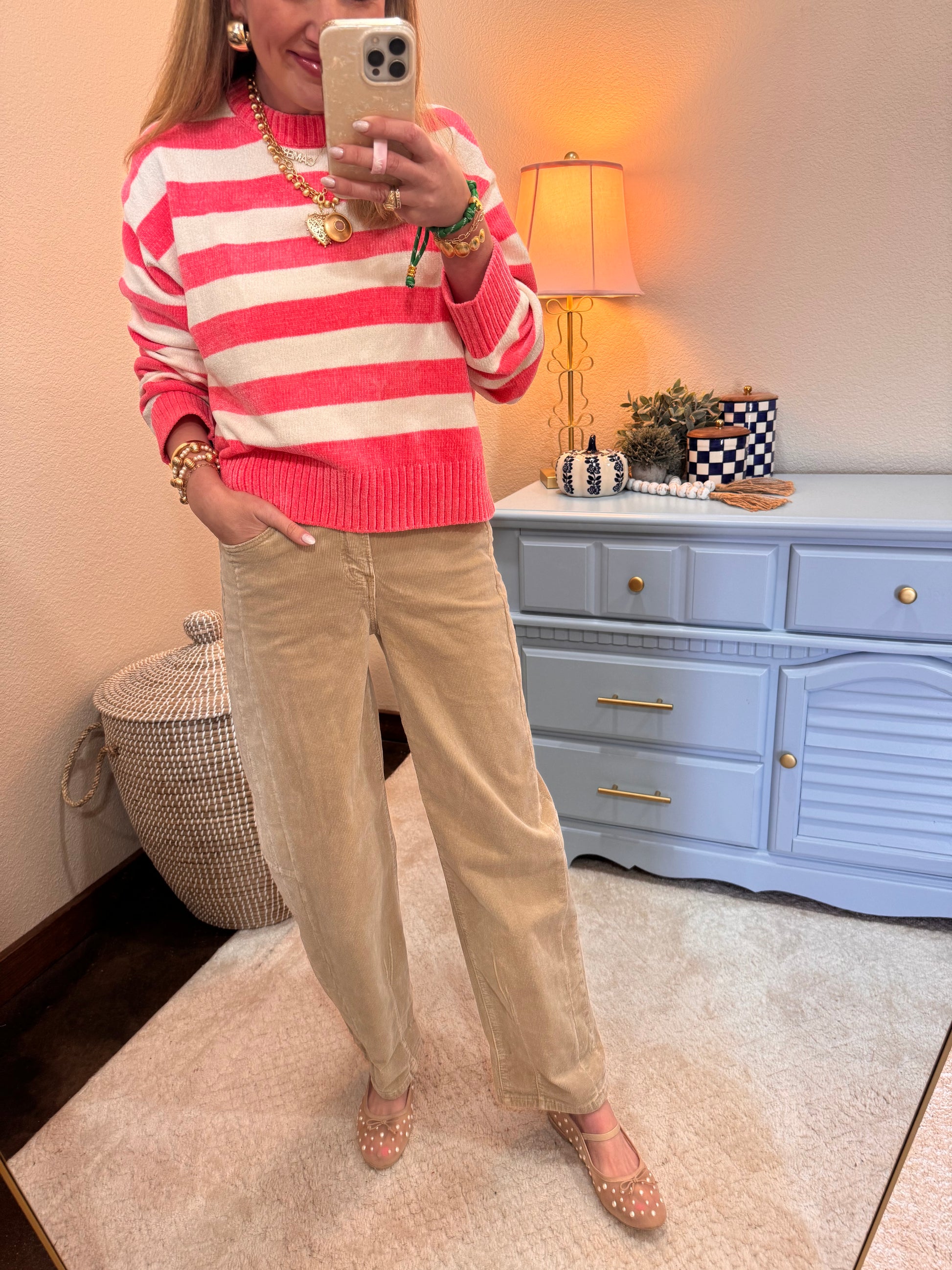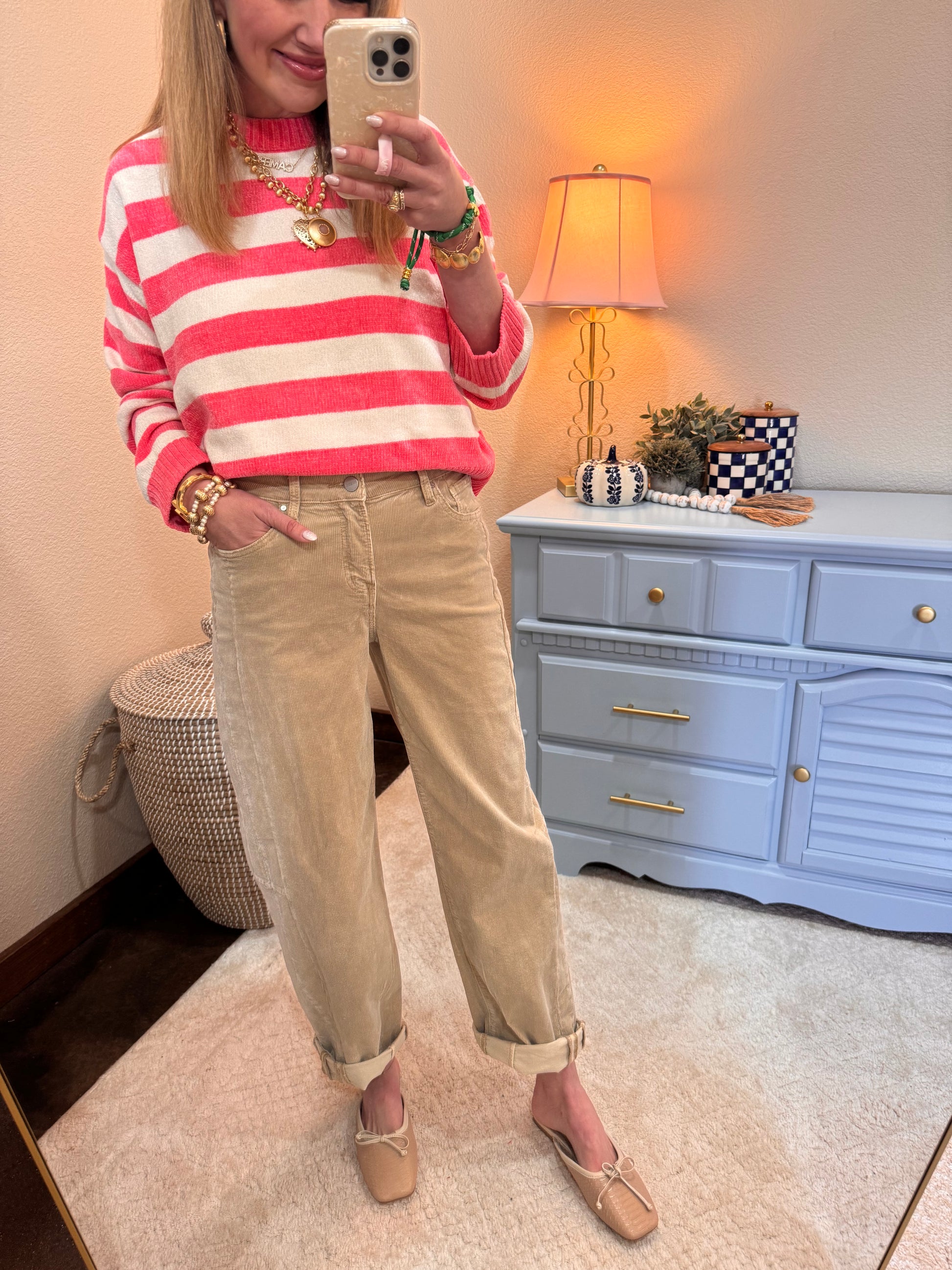 Look how cute these new little corduroy pants are?! A mild barrel fit and adorable!!! You can wear them rolled as they come, or uncuff them for extra length. They are a roomy/relaxed fit, Macy is a 24/25 in pants and 5’7 wearing the 24.