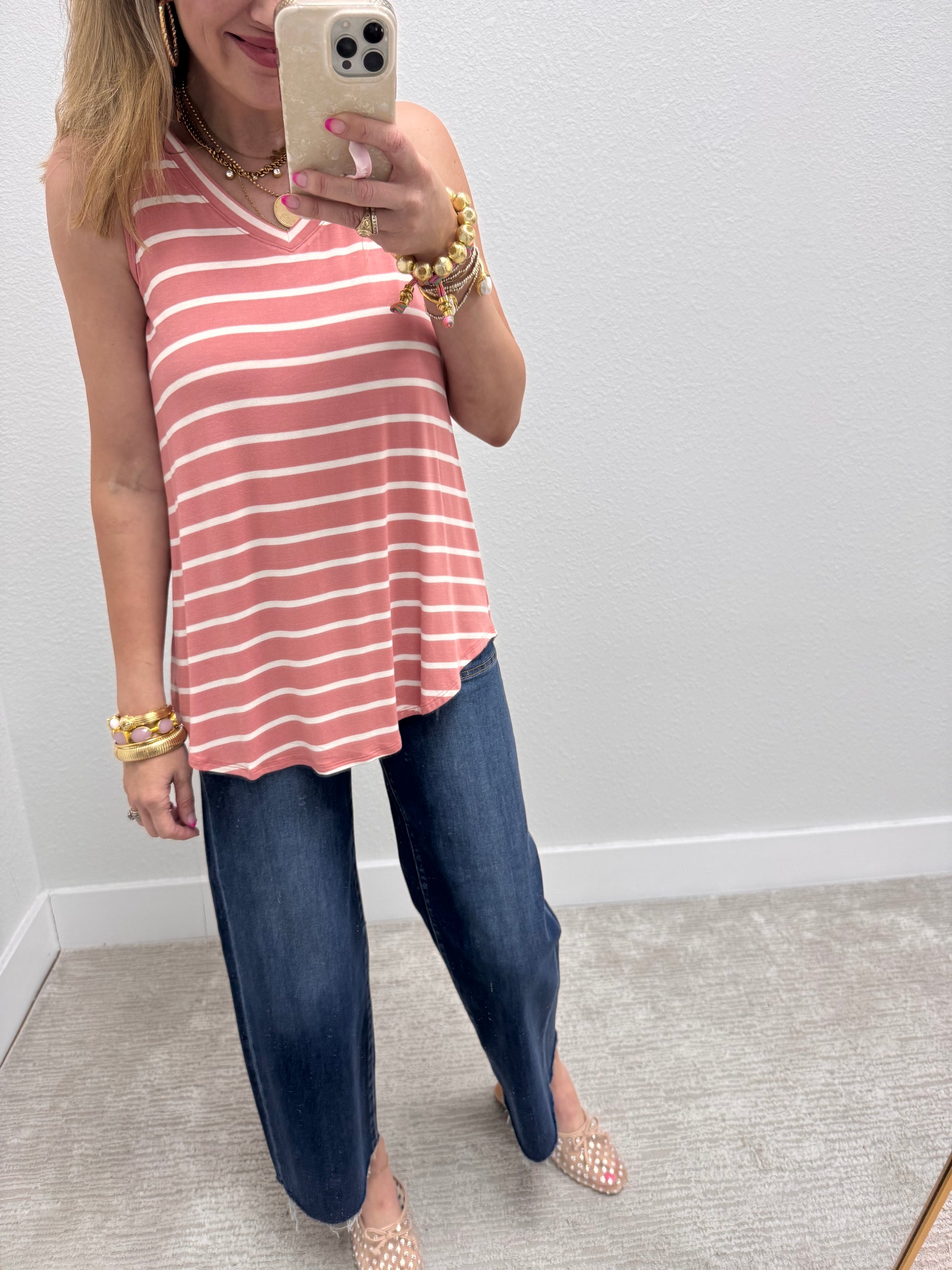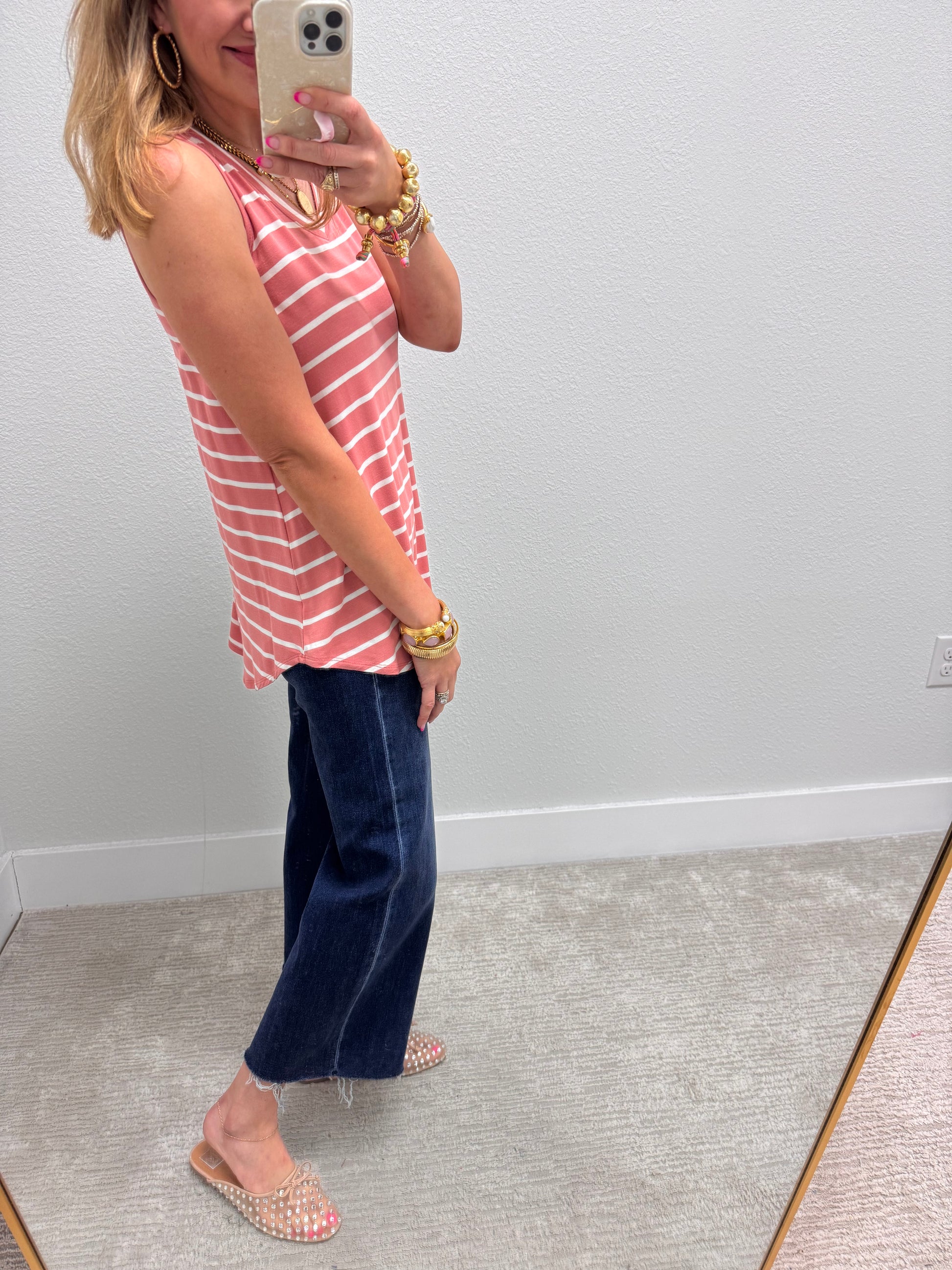 Sometimes you just need a simple little striped top. We love these for the fit and also the material. They are a super nice material with stretch, and the rounded bottom is just so flattering. Perfect to wear alone or add your favorite sheer long sleeve under. Relaxed TTS fit, Macy is a 2/4 and 5’7 wearing the small
