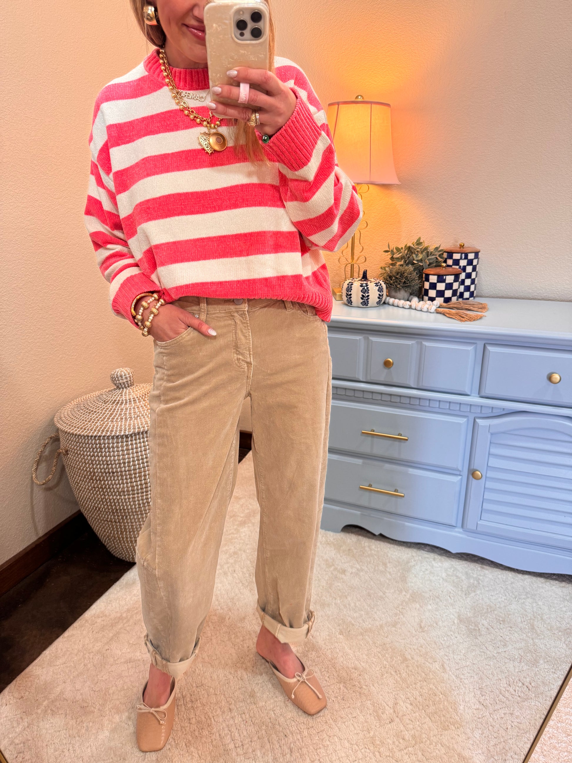 A simple but adorable little sweater! & an amazing material and SO soft! It’s a relaxed fit, Macy is a 2/4 and 5’7 wearing the small. 100% Poly