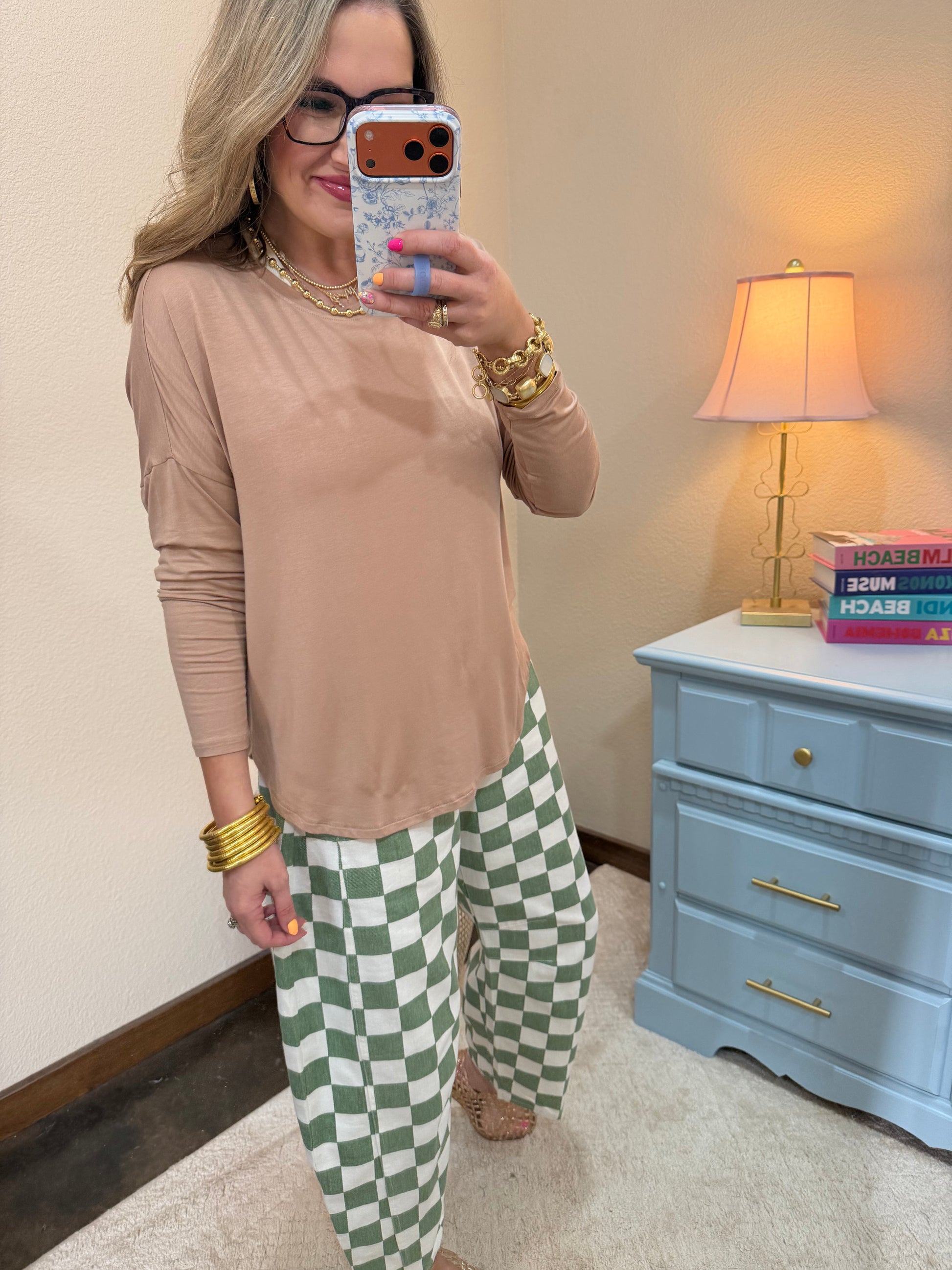 Meet your new go-to for effortless style. This luxe basic long sleeve top in a warm tan hue is the perfect blend of comfort and sophistication. Soft, versatile, and endlessly wearable, it pairs beautifully with everything from your favorite denim to sleek trousers. Whether you're layering up or keeping it simple, this piece brings that premium feel to every outfit.