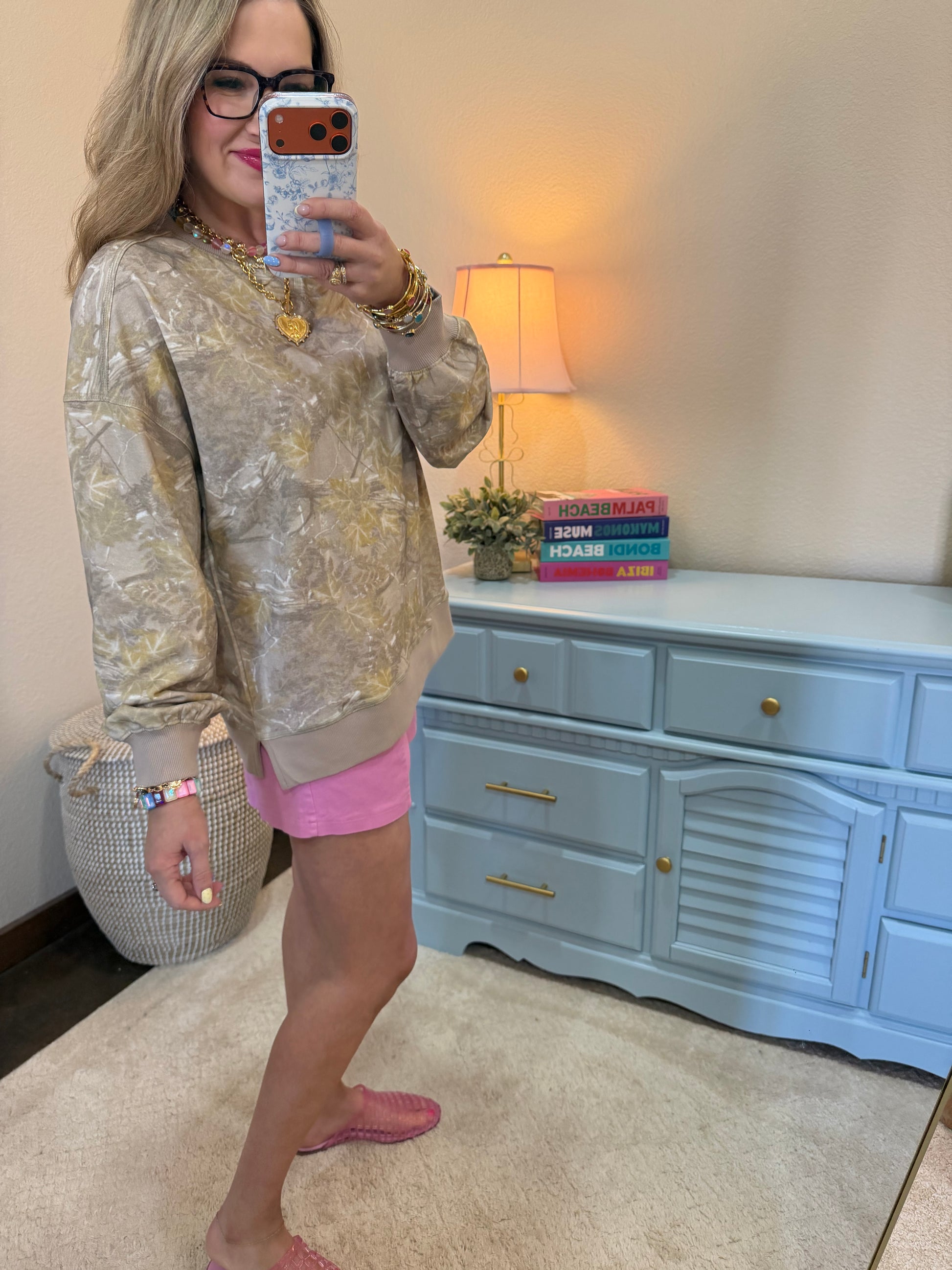 Meet your new go-to for effortless style! This oversized round neck camo knit top in soft taupe tones is the perfect blend of cozy and cool. The relaxed fit drapes beautifully while the subtle camo pattern adds just the right amount of edge to any outfit. Whether you're running errands or meeting friends for coffee, this versatile piece keeps you comfortable and chic all day long.