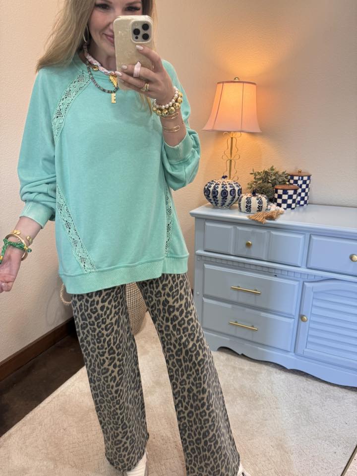 A standout piece that effortlessly combines color and texture. This turquoise pullover features delicate lace detailing that adds a feminine touch to the relaxed silhouette, making it perfect for everything from weekend brunches to casual evenings out.