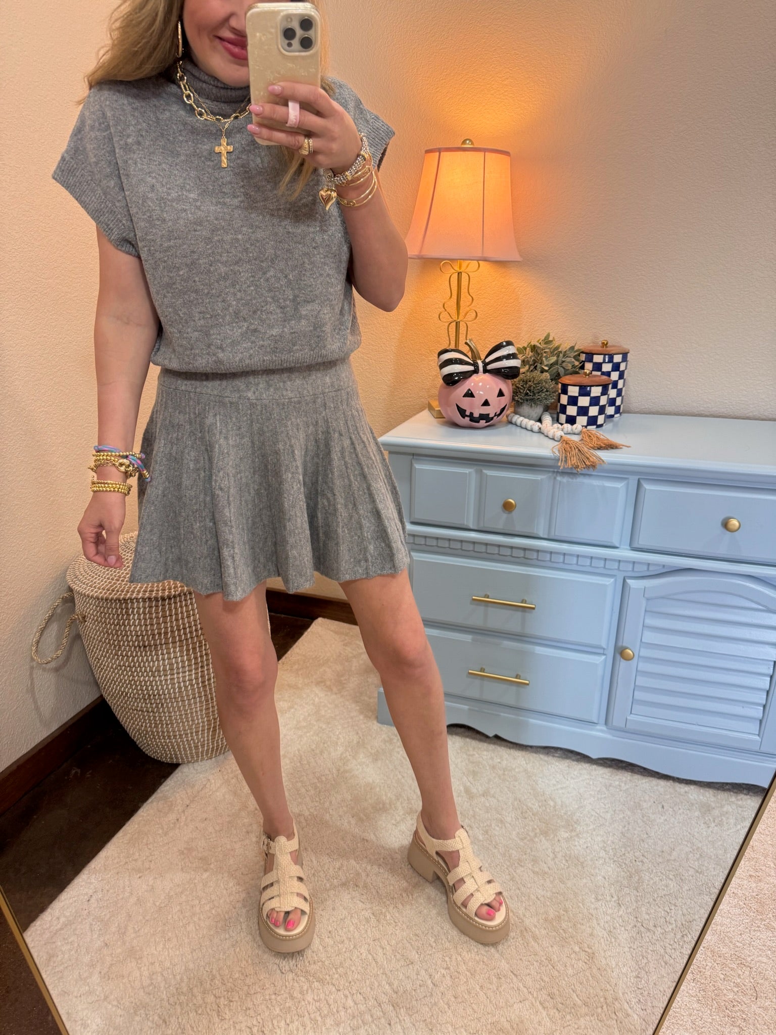 The cutest outfit ever and the most amazing material!!! The skirt is an elastic waist and it is a relaxed TTS fit, Macy is a 2/4 and 5'7 wearing the small