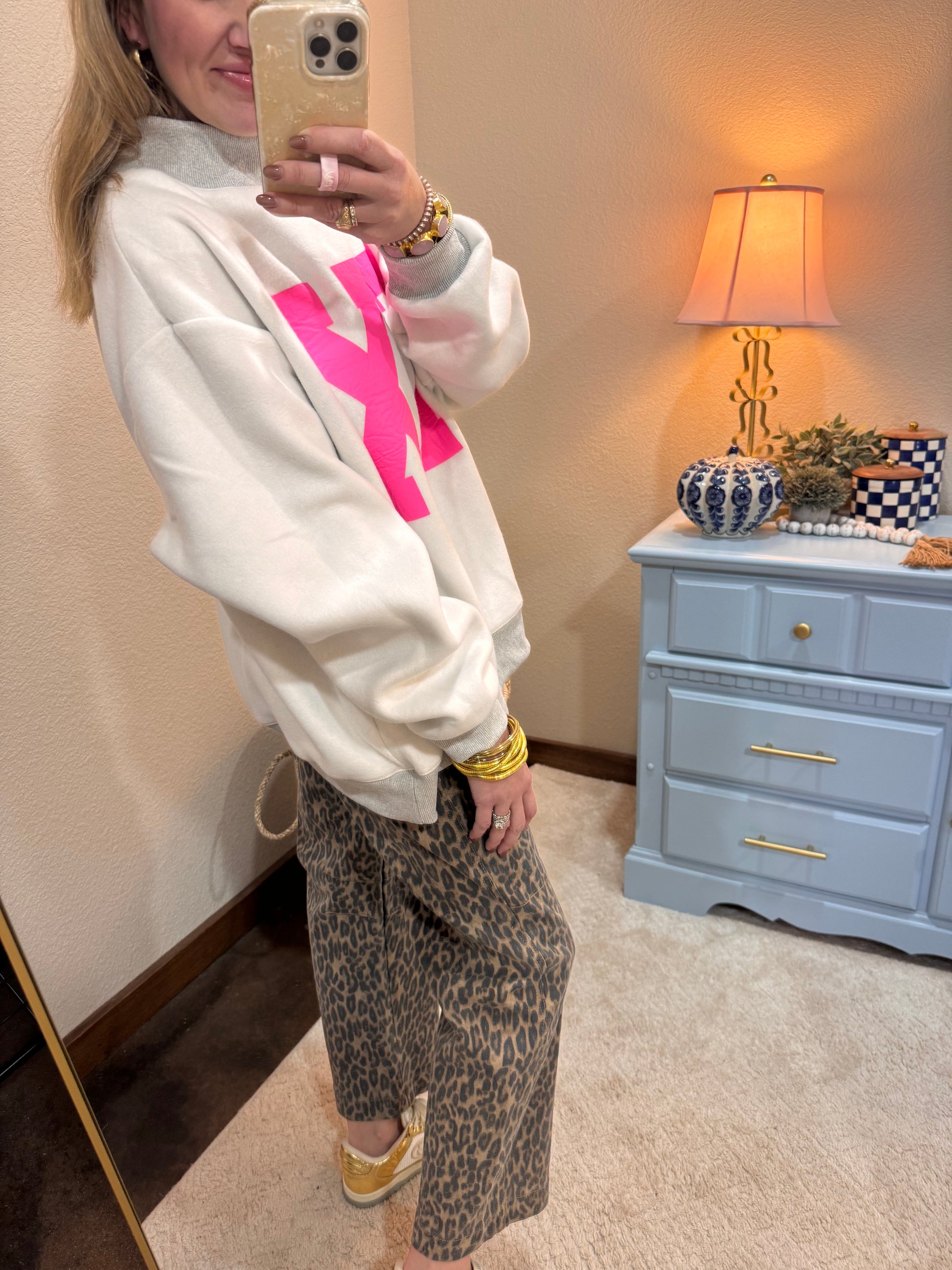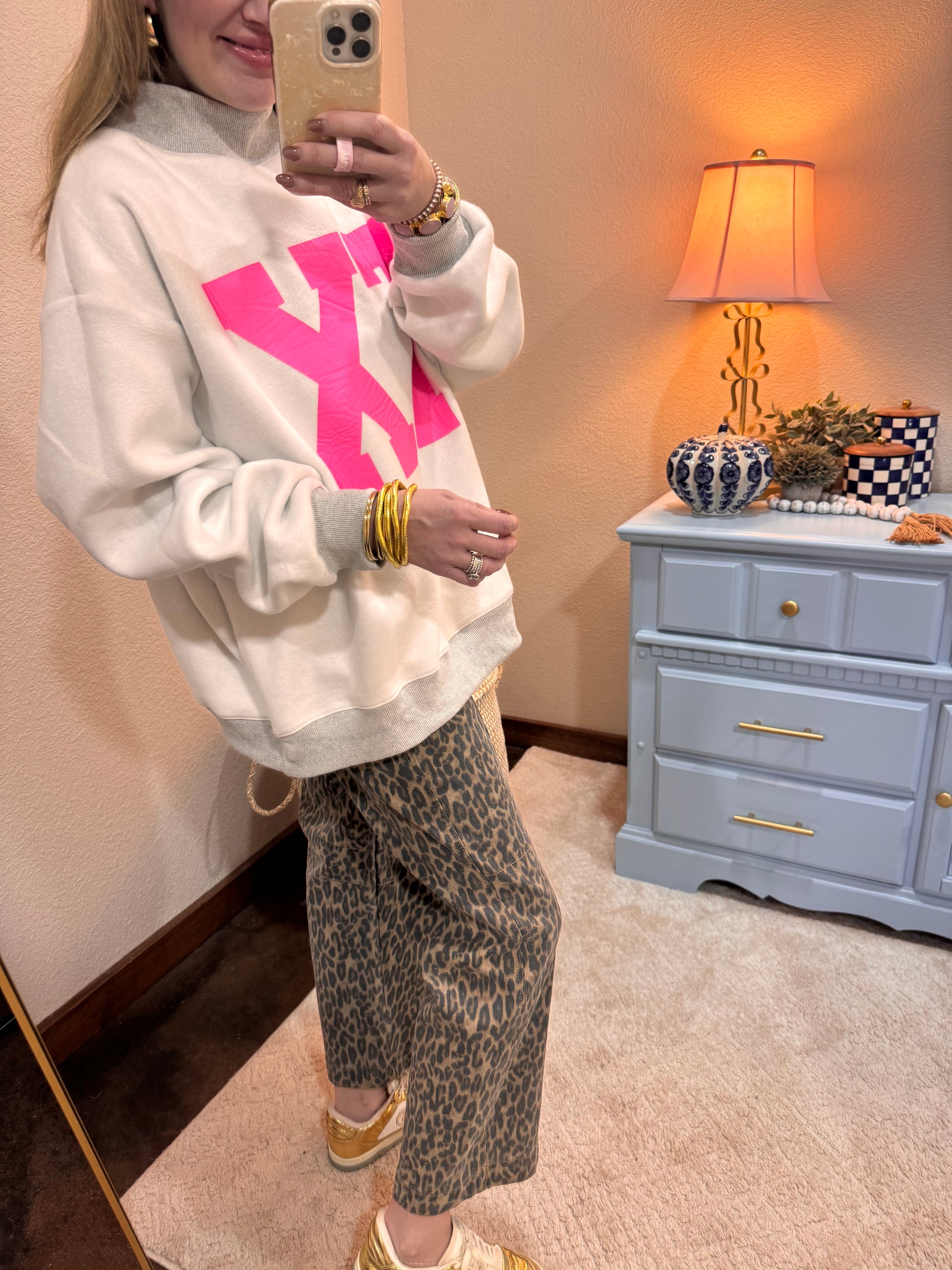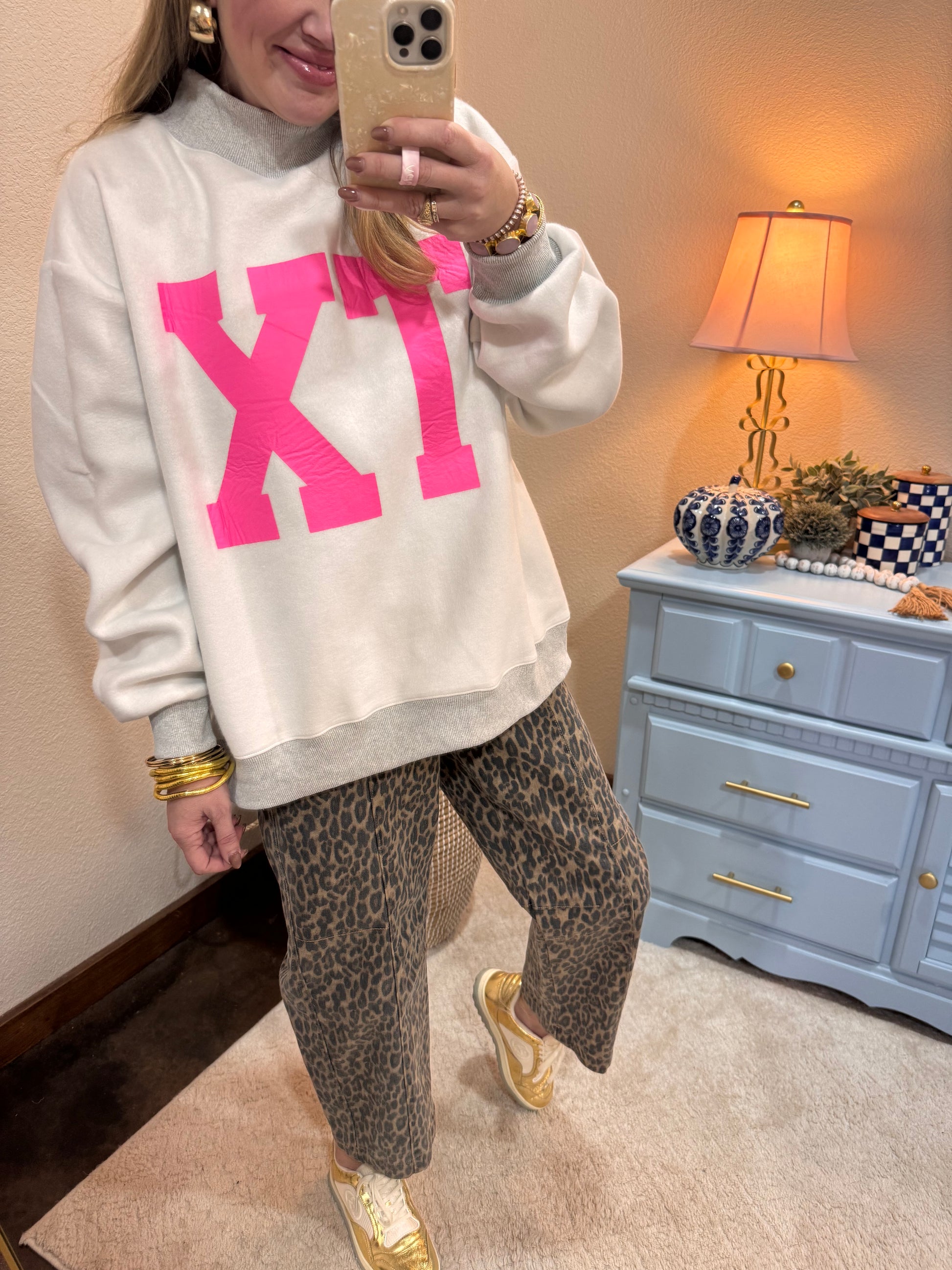 We are sooooo excited about these. Reversible and the cutest fit ever. Slightly oversized and the cutest mock neck. Macy is a 2/4 and 5’7 wearing the S/M. 52 cotton, 48 poly.