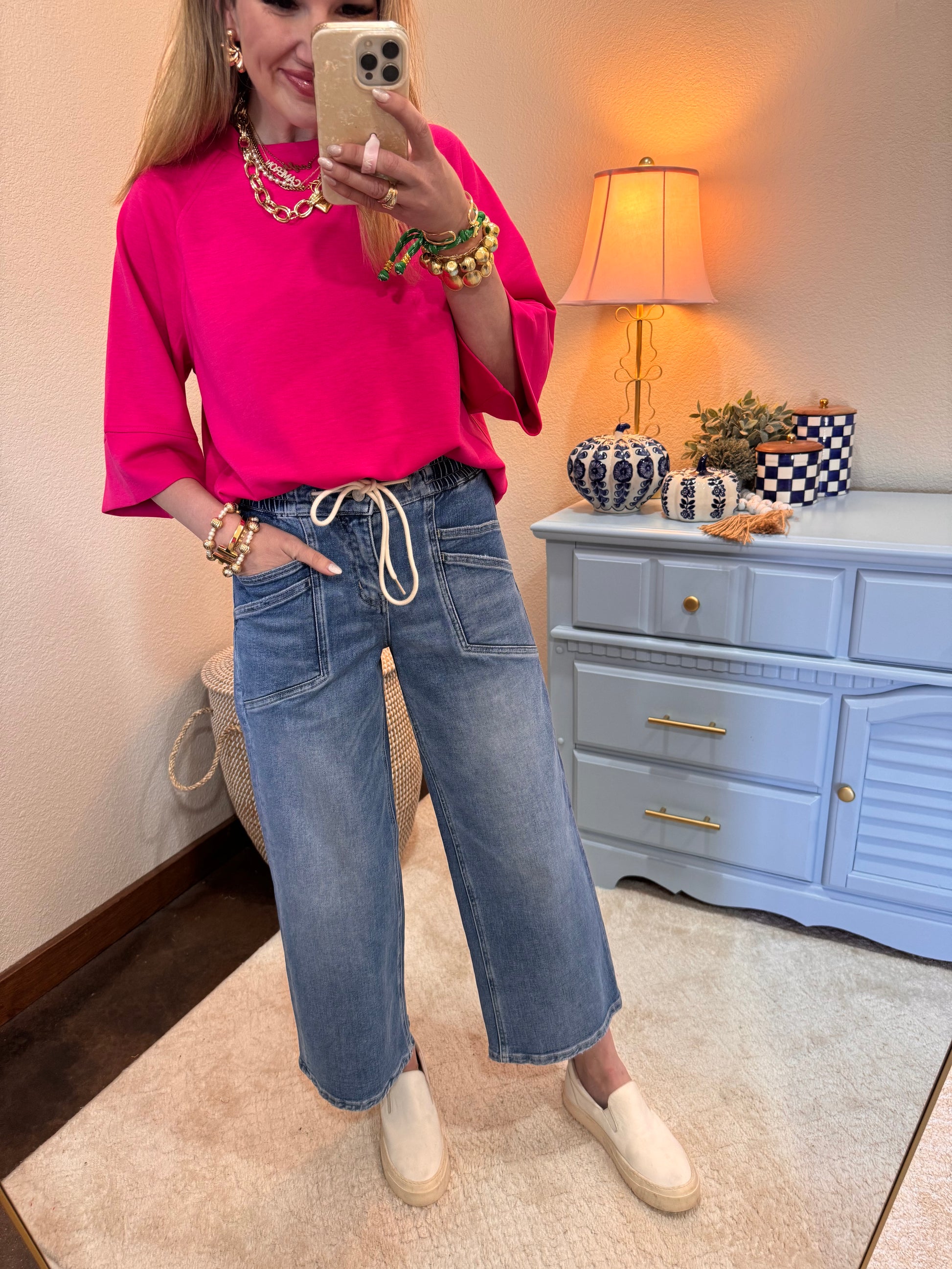 The cutest pair of high rise drawstring waistband wide leg jeans! Comfort stretch denim with a finished hem and cropped length. 94.5% Cotton, 4.5% Polyester, 1% Spandex. Macy is an 24 or 25 and she is wearing a 24. These have approx a 10” rise and approx a 26.5” inseam, Macy is 5’7.