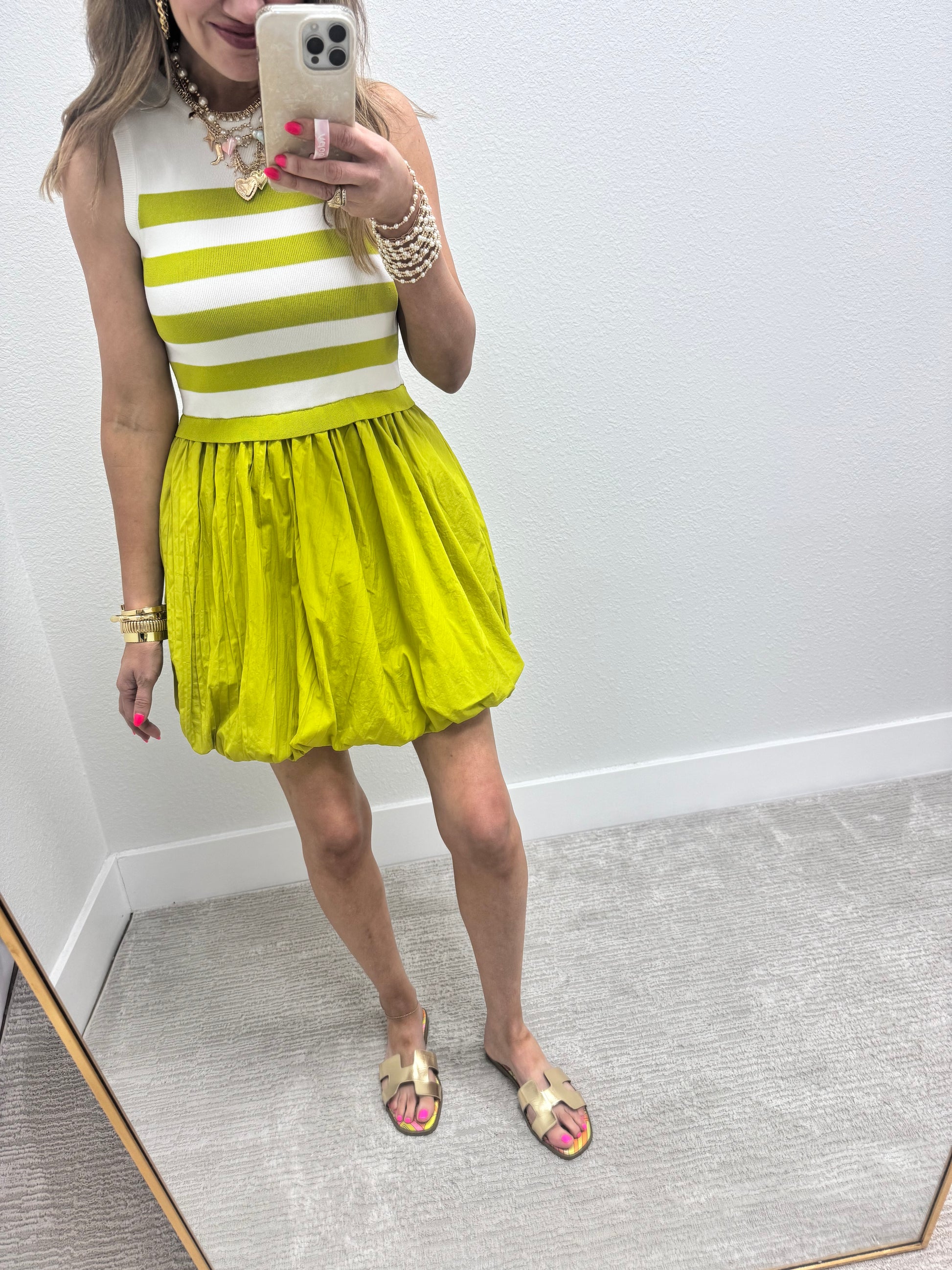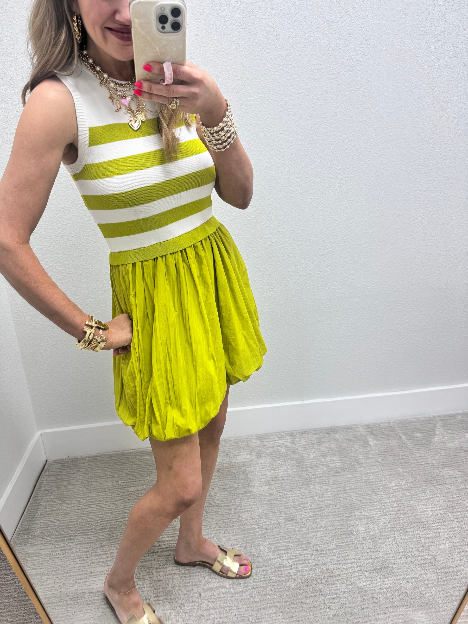 The cutest little bubble dress ever!! A fitted tts, it is fitted and stretchy across the chest. Macy is a 2/4 and 5’7 wearing the small
