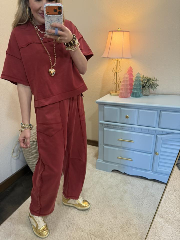 This set is just amazing all around. We love the comfort and soft fabric but has the best little details to elevate it! Mineral Washed Exposed Seam Detail Short Sleeve Top and Elastic Waistband Easy Barrel Pants Set