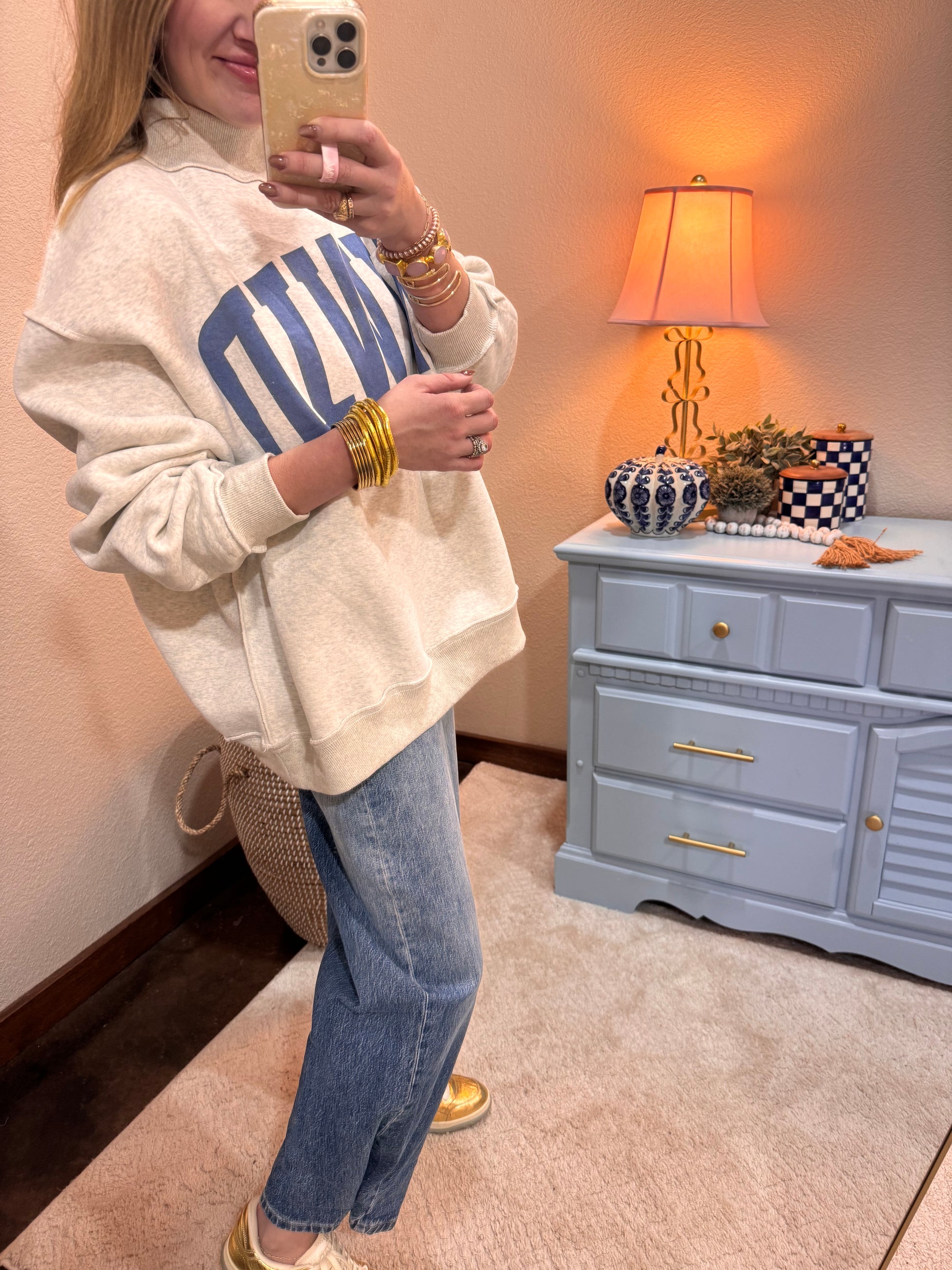 We are sooooo excited about these. Reversible and the cutest fit ever. Slightly oversized and the cutest mock neck. Macy is a 2/4 and 5’7 wearing the S/M. 52 cotton, 48 poly.