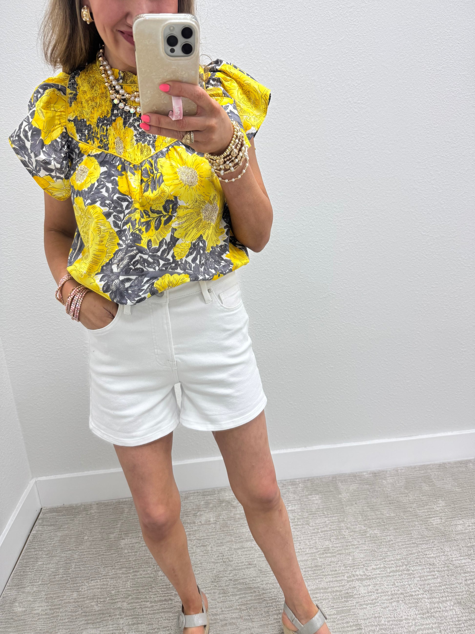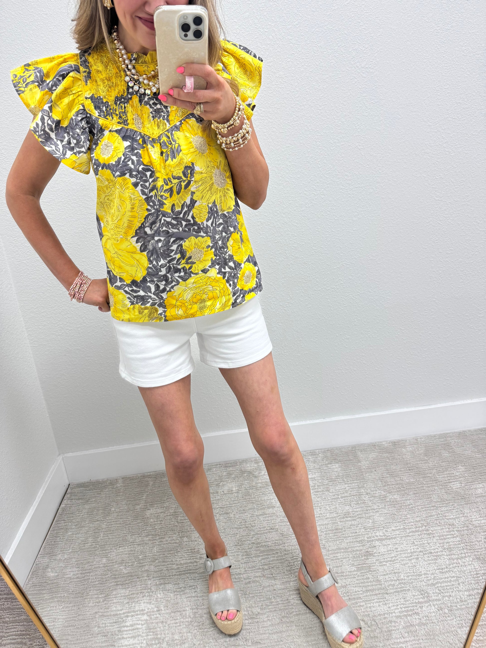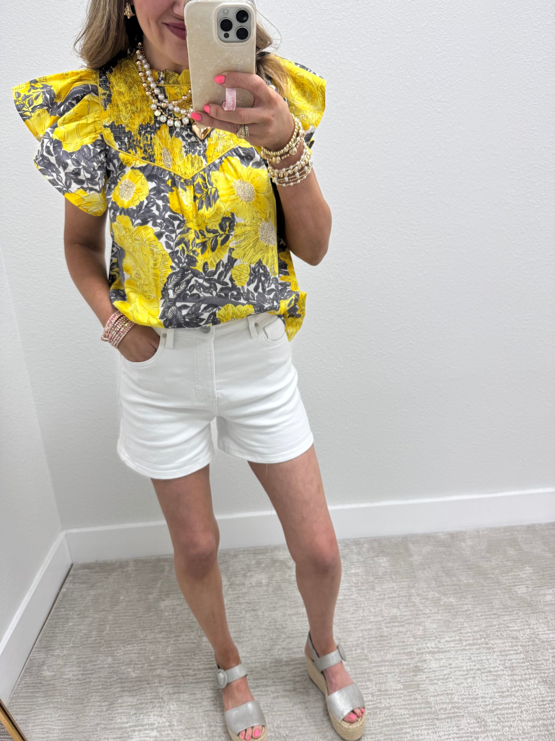 Yellow and Gray Smocked Top Flutter Sleeve Top