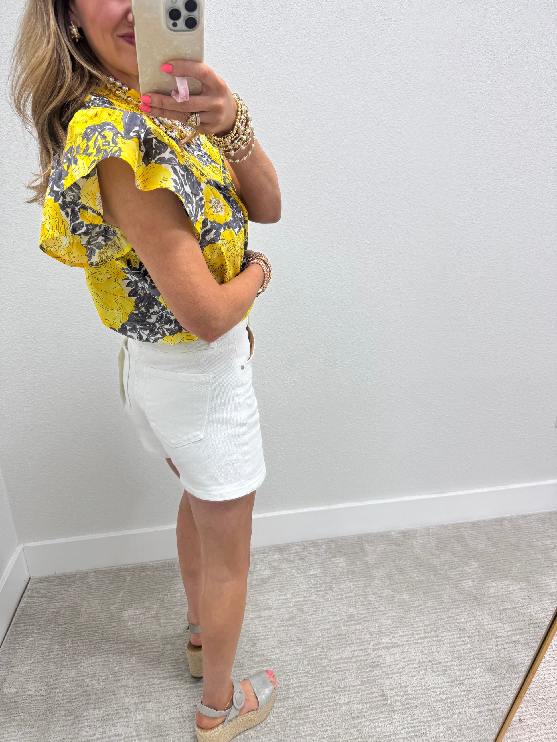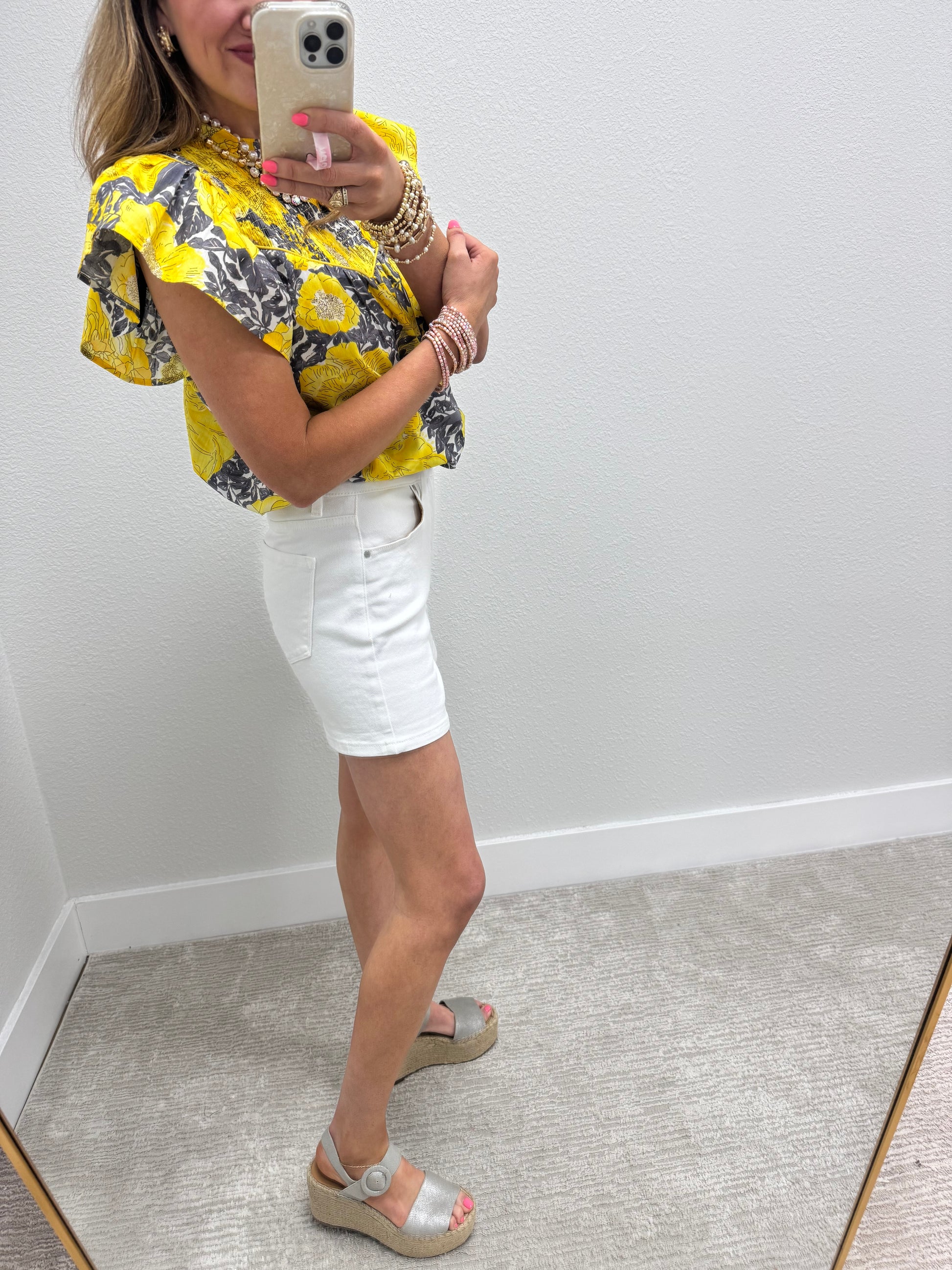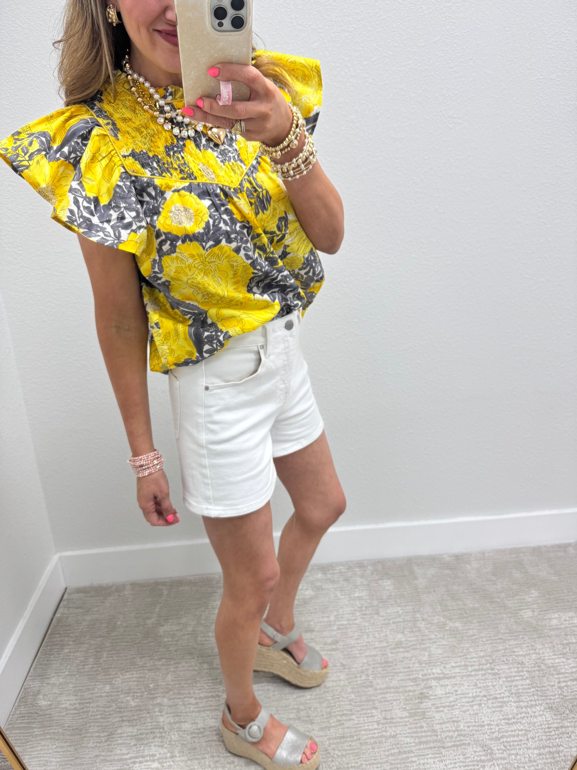 Yellow and Gray Smocked Top Flutter Sleeve Top